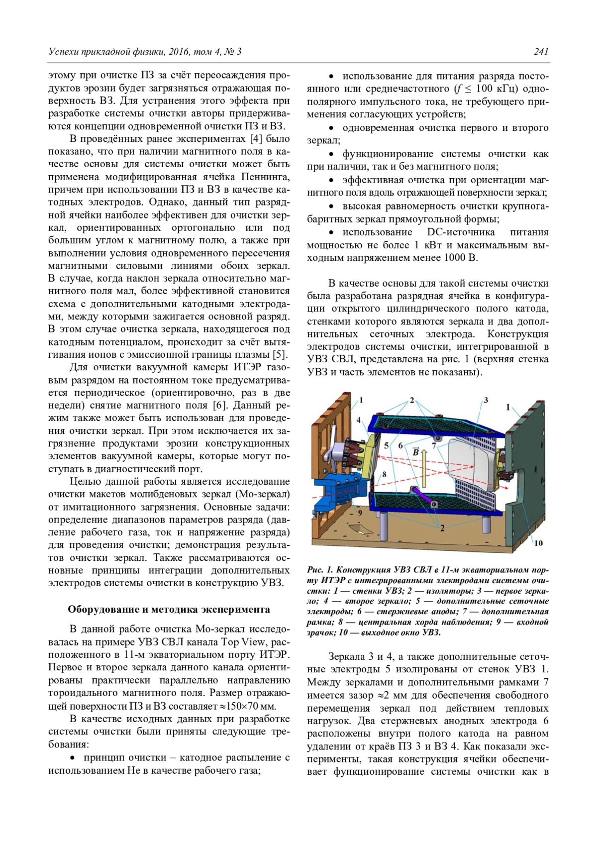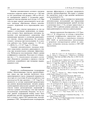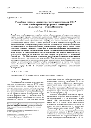 Разработана комбинированная разрядная ячейка, обеспечивающая одновременную очистку первого и второго зеркал в оптических диагностиках ИТЭР как при наличии магнитного поля, ориентированного вдоль очищаемой поверхности зеркала в режиме разряда с магнитоизолированным анодом (пеннинговского разряда), так и без магнитного поля в режиме цилиндрического полого катода. В обоих режимах очистки металлические зеркала являются катодными электродами разрядной ячейки и находятся под одинаковым потенциалом относительно изолированного анода, расположенного внутри полого катода. Дополнительные катодные электроды изготовлены из металлической сетки. Разрядная ячейка изолирована от стенок диагностического порта. Предусмотрено функционирование системы очистки в среднечастотном импульсном режиме при наличии диэлектрических загрязнений и в режиме постоянного тока при очистке от металлических загрязнений. Рабочий газ — He. Представлены результаты исследования функционирования системы очистки Mo-зеркал в магнитном поле величиной 0,2 Тл и без магнитного поля в технологическом режиме, соответствующем отключению тороидального поля. Эксперименты проводились с использованием разрядной ячейки, интегрированной в макет узла входного зеркала диагностики «Спектроскопия водородных линий», расположенного в 11-м экваториальном порту ИТЭР. В качестве имитационного загрязнения использовалось Al-покрытие.