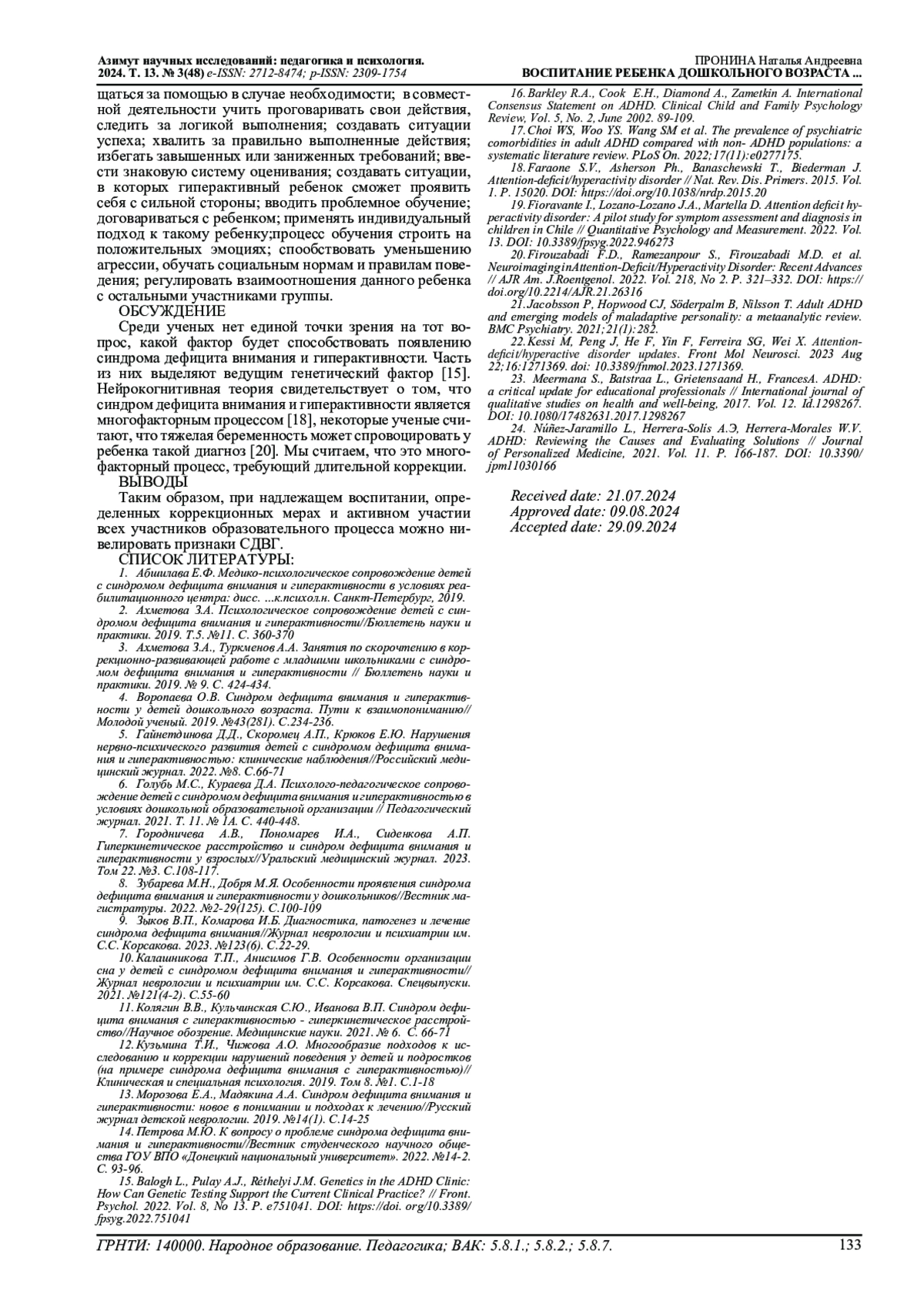 12. Кузьмина Т.И., Чижова А.О. Многообразие подходов к исследованию и коррекции нарушений поведения у детей и подростков (на примере синдрома дефицита внимания с гиперактивностью)//Клиническая и специальная психология. 2019. Том 8. №1. С.1-18. EDN: UAYQYM