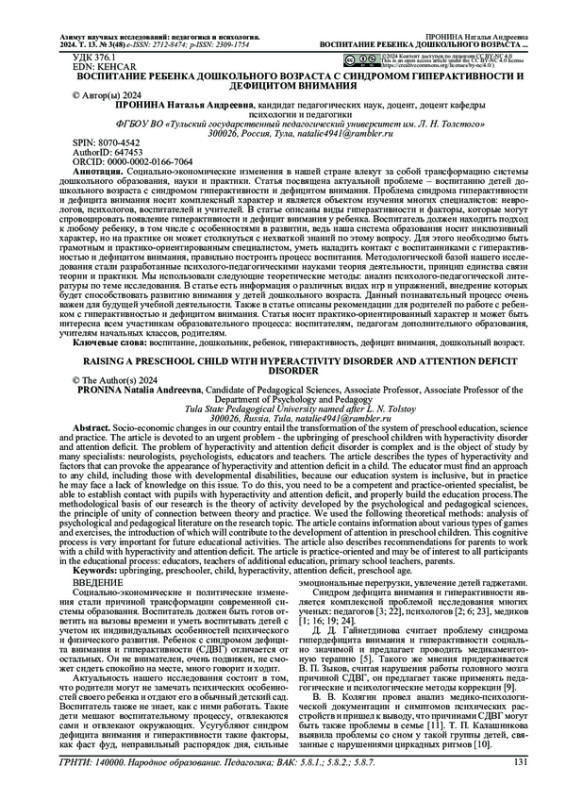 Социально-экономические изменения в нашей стране влекут за собой трансформацию системы дошкольного образования, науки и практики. Статья посвящена актуальной проблеме - воспитанию детей дошкольного возраста с синдромом гиперактивности и дефицитом внимания. Проблема синдрома гиперактивности и дефицита внимания носит комплексный характер и является объектом изучения многих специалистов: неврологов, психологов, воспитателей и учителей. В статье описаны виды гиперактивности и факторы, которые могут спровоцировать появление гиперактивности и дефицит внимания у ребенка. Воспитатель должен находить подход к любому ребенку, в том числе с особенностями в развитии, ведь наша система образования носит инклюзивный характер, но на практике он может столкнуться с нехваткой знаний по этому вопросу. Для этого необходимо быть грамотным и практико-ориентированным специалистом, уметь наладить контакт с воспитанниками с гиперактивностью и дефицитом внимания, правильно построить процесс воспитания. Методологической базой нашего исследования стали разработанные психолого-педагогическими науками теория деятельности, принцип единства связи теории и практики. Мы использовали следующие теоретические методы: анализ психолого-педагогической литературы по теме исследования. В статье есть информация о различных видах игр и упражнений, внедрение которых будет способствовать развитию внимания у детей дошкольного возраста. Данный познавательный процесс очень важен для будущей учебной деятельности. Также в статье описаны рекомендации для родителей по работе с ребенком с гиперактивностью и дефицитом внимания. Статья носит практико-ориентированный характер и может быть интересна всем участникам образовательного процесса: воспитателям, педагогам дополнительного образования, учителям начальных классов, родителям.