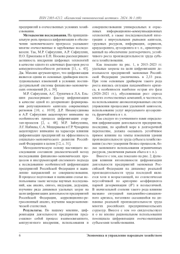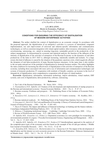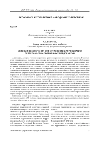 Авторами уточнено содержание цифровизации как экономического понятия. В соответствии с предлагаемым подходом цифровизация деятельности предприятия представляет собой процесс взаимосвязанного, конгруэнтного внедрения, использования и совершенствования универсальных и отраслевых информационно-коммуникационных технологий, а также последовательной интеграции с виртуальными рынками капитала, трудовых ресурсов, информации, сервисов, краудсорсинга, аутсорсинга и т. п., ориентированный на обеспечение долгосрочного, устойчивого роста производительности труда субъекта хозяйствования. Как продемонстрировал экономико-статистический анализ, функция влияния интенсивности цифровизации деятельности предприятий экономики Российской Федерации на динамику реальной производительности труда в 2015–2023 гг. является хотя и возрастающей, но статистически неустойчивой и неэластичной. В значительной степени такого рода влияние вызвано ситуацией пандемийно-санкционного кризиса, негативно сказавшейся на динамике реальной производительности труда многих российских предпринимательских структур. Вместе с тем это свидетельствует и о не вполне рациональном использовании потенциала цифровизации отечественными субъектами хозяйствования. Авторами выделены основные условия роста эффективности цифровизации деятельности предприятий экономики Российской Федерации, в том числе связанные с более активным использованием информационно-коммуникационных технологий и систем отечественного производства, IT-кооперацией с резидентами дружественных стран, ростом уровня интегративности цифровизации, более комплексной кооперацией со всеми видами виртуальных рынков.