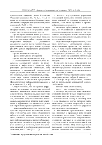 Целесообразность системного учета институтов, оказывающих влияние на интенсивность и эффективность процессов цифровизации деятельности организации. Под институтом в современной экономической науке традиционно понимается комплекс взаимосвязанных, взаимообусловленных, конгруэнтных норм, правил, стандартов экономического поведения и механизмов принуждения (формального или неформального характера) к их исполнению [8, с. 46].