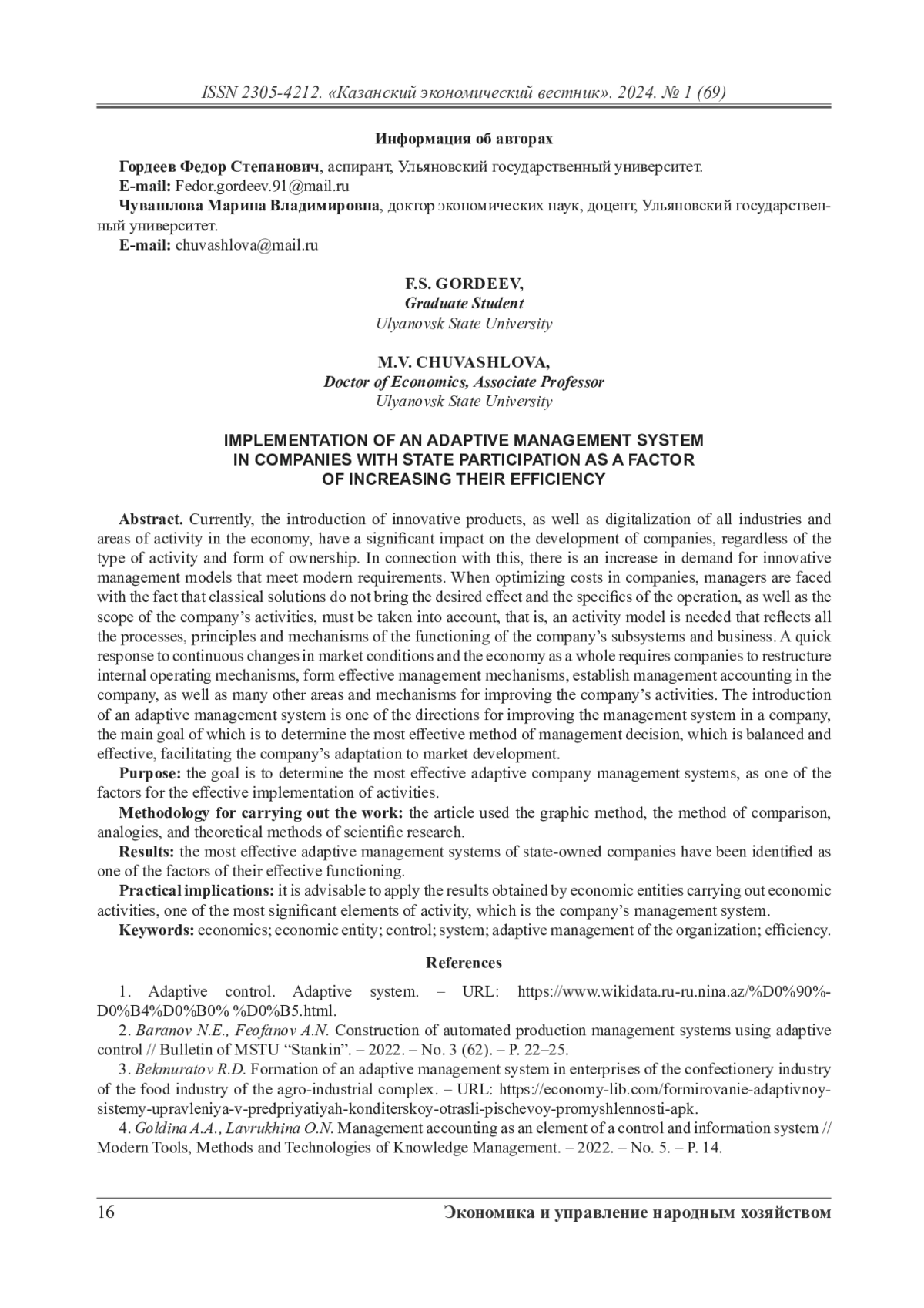 2. Баранов Н.Е., Феофанов А.Н. Построение автоматизированных систем управления производством с использованием адаптивного управления // Вестник МГТУ «Станкин». - 2022. - № 3 (62). - С. 22-25.