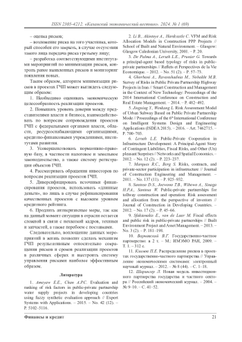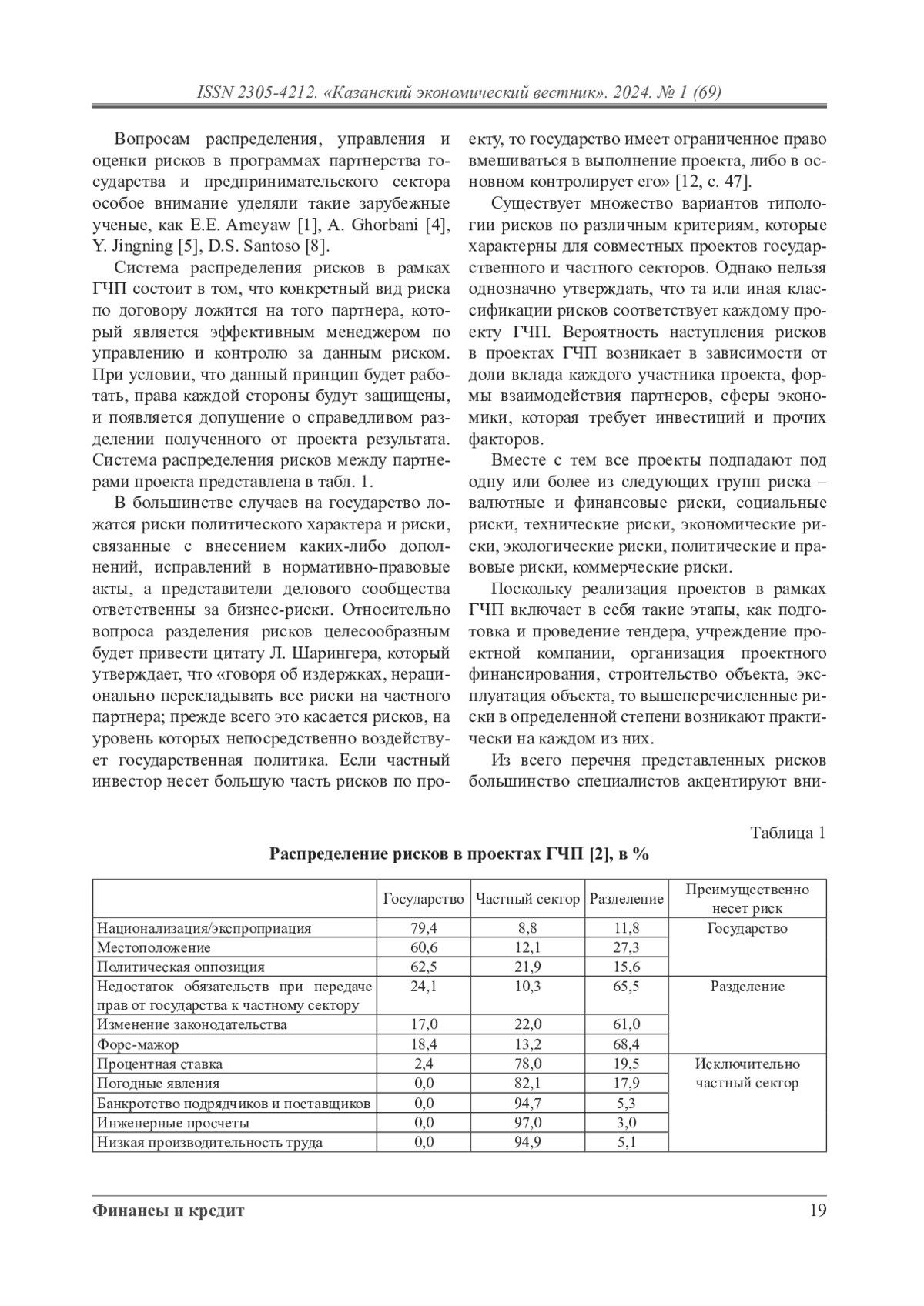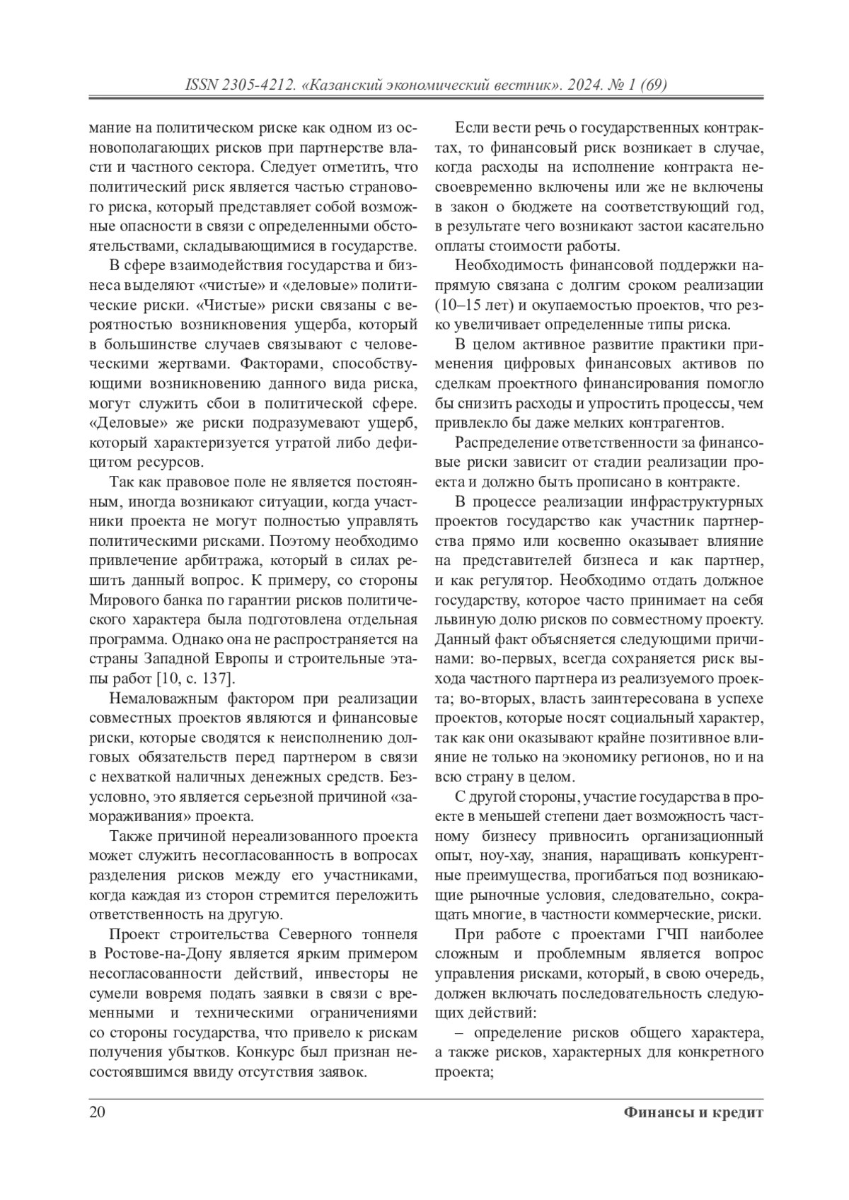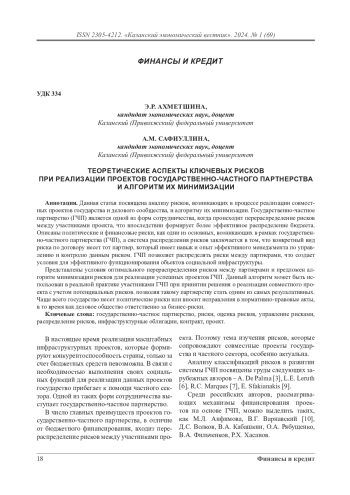 Данная статья посвящена анализу рисков, возникающих в процессе реализации совместных проектов государства и делового сообщества, и алгоритму их минимизации. Государственно-частное партнерство (ГЧП) является одной из форм сотрудничества, когда происходит перераспределение рисков между участниками проекта, что впоследствии формирует более эффективное распределение бюджета. Описаны политические и финансовые риски, как одни из основных, возникающих в рамках государственно-частного партнерства (ГЧП), а система распределения рисков заключается в том, что конкретный вид риска по договору несет тот партнер, который имеет навык и опыт эффективного менеджмента по управлению и контролю данным риском. ГЧП позволяет распределять риски между партнерами, что создает условия для эффективного функционирования объектов социальной инфраструктуры.