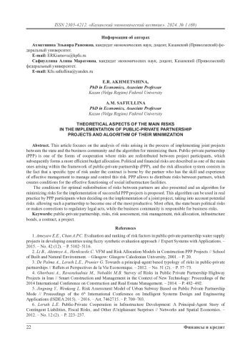 Представлены условия оптимального перераспределения рисков между партнерами и предложен алгоритм минимизации рисков для реализации успешных проектов ГЧП. Данный алгоритм может быть использован в реальной практике участниками ГЧП при принятии решения о реализации совместного проекта с учетом потенциальных рисков. позволяя такому партнерству стать одним из самых результативных. Чаще всего государство несет политические риски или вносит исправления в нормативно-правовые акты, в то время как деловое общество ответственно за бизнес-риски.