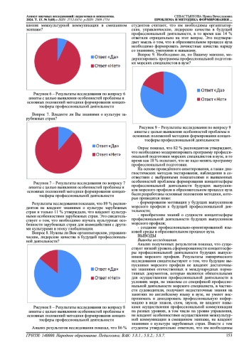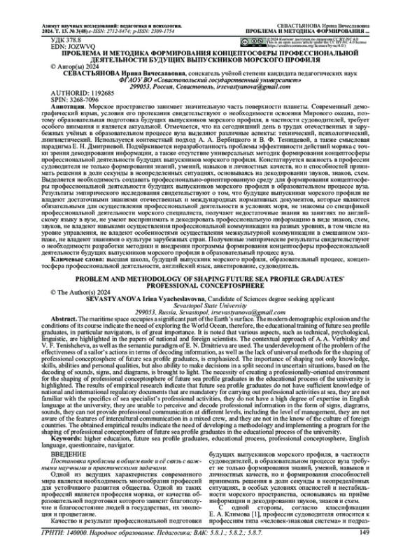 Морское пространство занимает значительную часть поверхности планеты. Современный демографический взрыв, условия его протекания свидетельствуют о необходимости освоения Мирового океана, поэтому образовательная подготовка будущих выпускников морского профиля, в частности судоводителей, требует особого внимания и является актуальной. Отмечается, что на сегодняшний день в трудах отечественных и зарубежных учёных в образовательном процессе вуза выделяют различные аспекты: технический, психологический, лингвистический. Используется контекстный подход А. А. Вербицкого и В. Ф. Тенищевой, а также смысловая парадигма Е. Н. Дмитриевой. Подчёркивается неразработанность проблемы эффективности действий моряка с точки зрения декодирования информации, а также отсутствие универсальных методик формирования концептосферы профессиональной деятельности будущих выпускников морского профиля. Констатируется важность в профессии судоводителя не только формирования знаний, умений, навыков и личностных качеств, но и способностей принимать решения в доли секунды в неопределенных ситуациях, основываясь на декодировании звуков, знаков, схем. Выделяется необходимость создавать профессионально-ориентированную среду для формирования концептосферы профессиональной деятельности будущих выпускников морского профиля в образовательном процессе вуза. Результаты эмпирического исследования свидетельствуют о том, что будущие выпускники морского профиля не владеют достаточными знаниями отечественных и международных нормативных документов, которые являются обязательными для осуществления профессиональной деятельности в условиях моря, не знакомы со спецификой профессиональной деятельности морского специалиста, получают недостаточные знания на занятиях по английскому языку в вузе, не умеют воспринимать и декодировать профессиональную информацию в виде знаков, схем, звуков, не владеют навыками осуществления профессиональной коммуникации на разных уровнях, в том числе на уровне управления, не владеют особенностями осуществления межкультурной коммуникации в смешанном экипаже, не владеют знаниями о культуре зарубежных стран. Полученные эмпирические результаты свидетельствуют о необходимости разработки методики и внедрения программы формирования концептосферы профессиональной деятельности будущих выпускников морского профиля в образовательный процесс вуза.