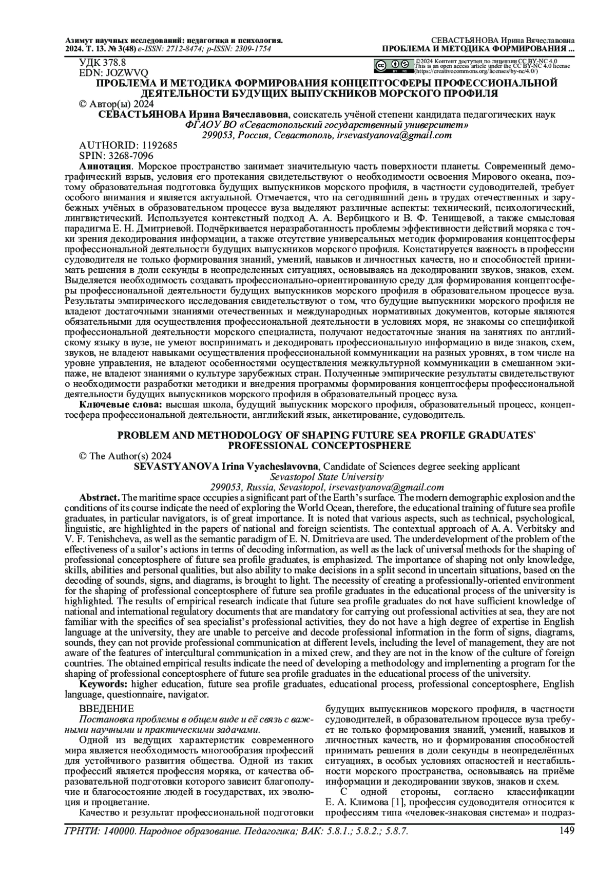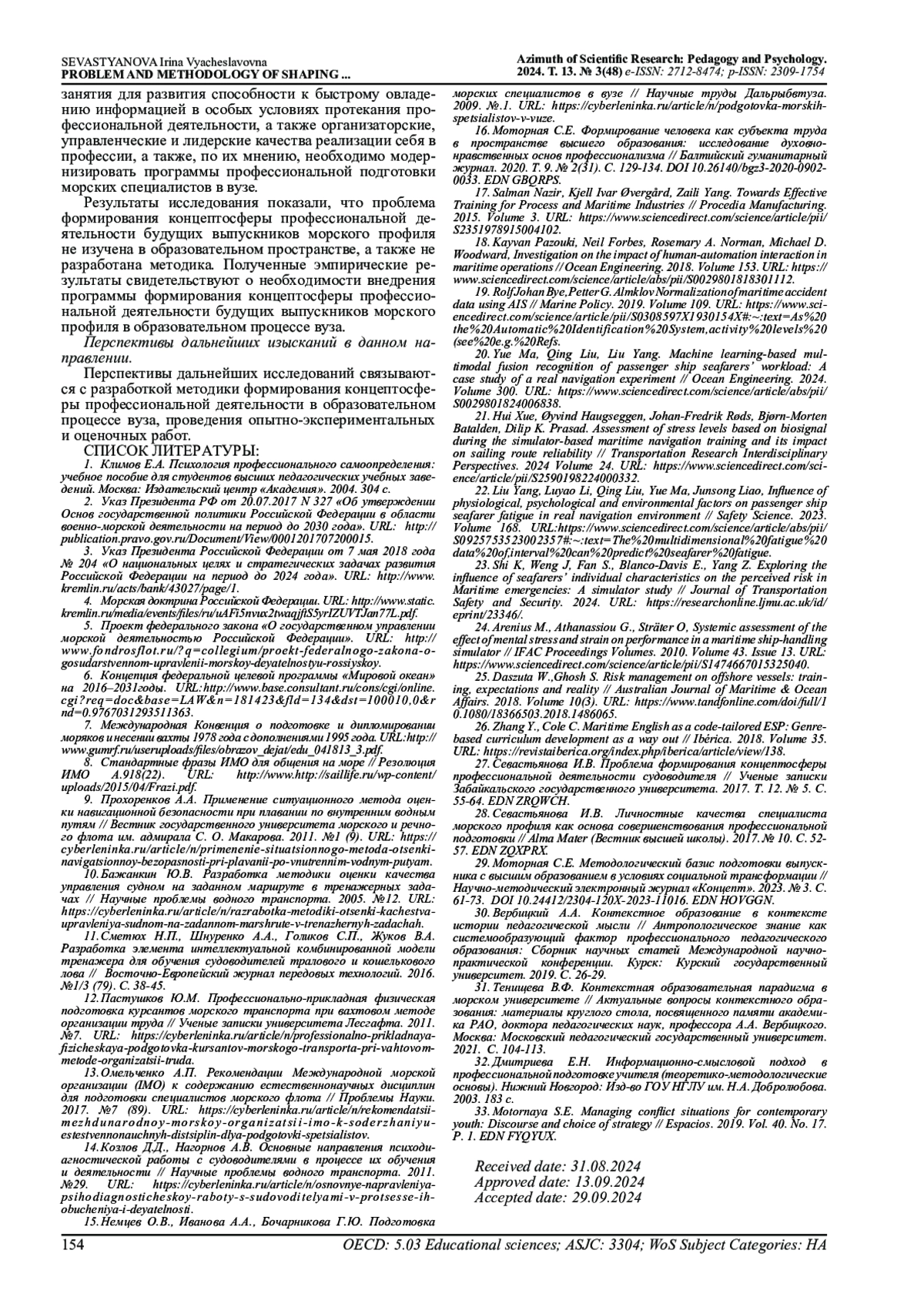 27. Севастьянова И.В. Проблема формирования концептосферы профессиональной деятельности судоводителя // Ученые записки Забайкальского государственного университета. 2017. Т. 12. № 5. С. 55-64. EDN: ZRQWCH