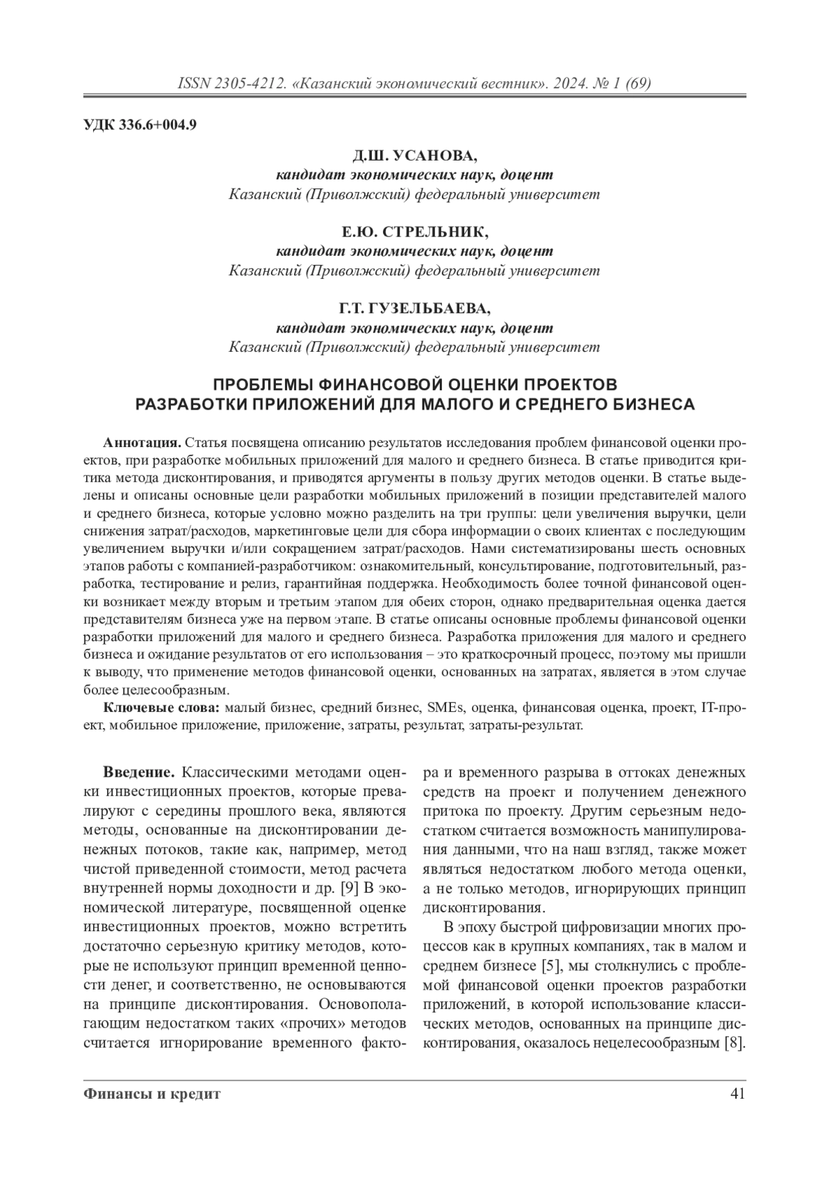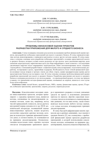 Статья посвящена описанию результатов исследования проблем финансовой оценки проектов, при разработке мобильных приложений для малого и среднего бизнеса. В статье приводится критика метода дисконтирования, и приводятся аргументы в пользу других методов оценки. В статье выделены и описаны основные цели разработки мобильных приложений в позиции представителей малого и среднего бизнеса, которые условно можно разделить на три группы: цели увеличения выручки, цели снижения затрат/расходов, маркетинговые цели для сбора информации о своих клиентах с последующим увеличением выручки и/или сокращением затрат/расходов. Нами систематизированы шесть основных этапов работы с компанией-разработчиком: ознакомительный, консультирование, подготовительный, разработка, тестирование и релиз, гарантийная поддержка. Необходимость более точной финансовой оценки возникает между вторым и третьим этапом для обеих сторон, однако предварительная оценка дается представителям бизнеса уже на первом этапе. В статье описаны основные проблемы финансовой оценки разработки приложений для малого и среднего бизнеса. Разработка приложения для малого и среднего бизнеса и ожидание результатов от его использования – это краткосрочный процесс, поэтому мы пришли к выводу, что применение методов финансовой оценки, основанных на затратах, является в этом случае более целесообразным.