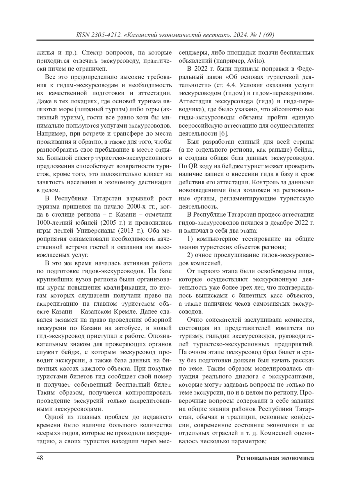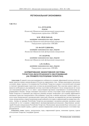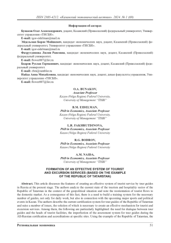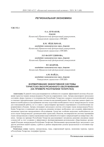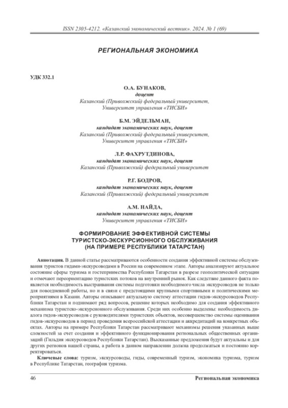 В данной статье рассматриваются особенности создания эффективной системы обслуживания туристов гидами-экскурсоводами в России на современном этапе. Авторы анализируют актуальное состояние сферы туризма и гостеприимства Республики Татарстан в разрезе геополитической ситуации и отмечают переориентацию туристских потоков на внутренний рынок. Как следствие данного факта появляется необходимость выстраивания системы подготовки необходимого числа экскурсоводов не только для повседневной работы, но и в связи с предстоящими крупными спортивными и политическими мероприятиями в Казани. Авторы описывают актуальную систему аттестации гидов-экскурсоводов Республики Татарстан и поднимают ряд вопросов, решение которых необходимо для создания эффективного механизма туристско-экскурсионного обслуживания. Среди них особенно выделены: необходимость диалога гидов-экскурсоводов с руководителями туристских объектов, несовершенство системы оценивания гидов-экскурсоводов в период проведения всероссийской аттестации и аккредитаций на конкретных объектах. Авторы на примере Республики Татарстан рассматривают механизмы решения указанных выше сложностей за счет создания и эффективного функционирования региональных общественных организаций (Гильдия экскурсоводов Республики Татарстан). Высказанные предложения будут актуальны и для других регионов нашей страны, а работа в данном направлении должна продолжаться и постоянно корректироваться.