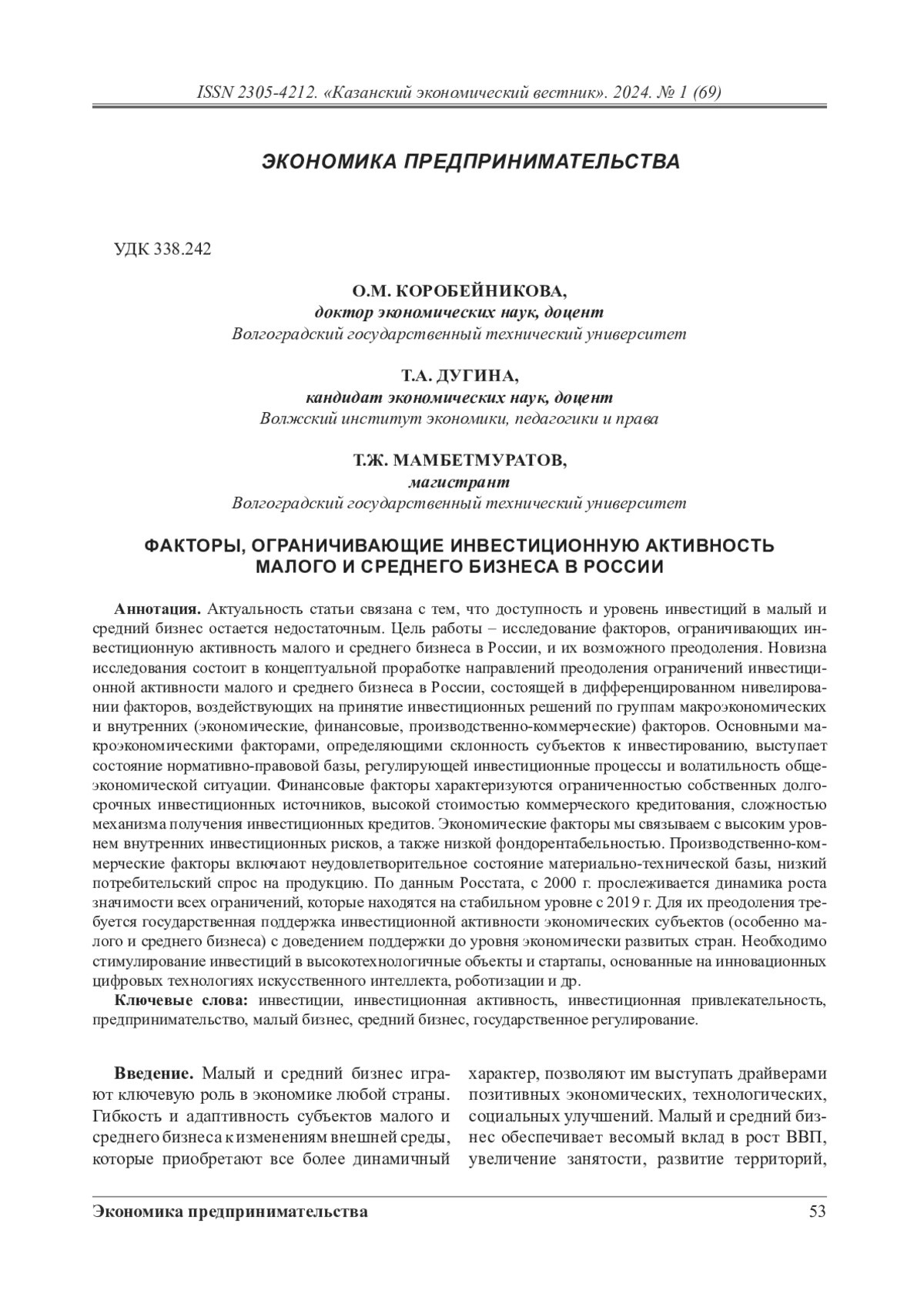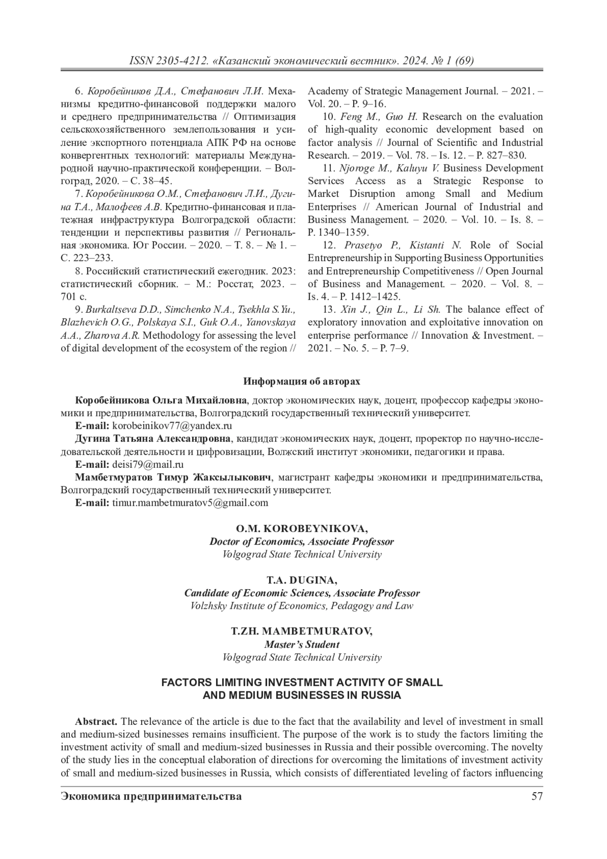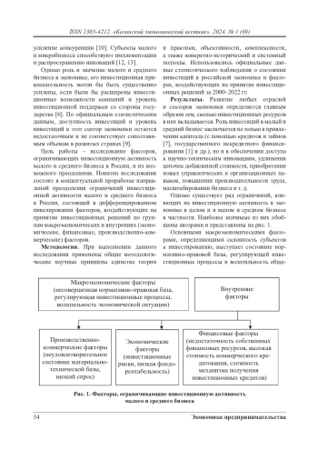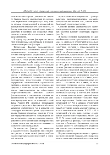 Актуальность статьи связана с тем, что доступность и уровень инвестиций в малый и средний бизнес остается недостаточным. Цель работы – исследование факторов, ограничивающих инвестиционную активность малого и среднего бизнеса в России, и их возможного преодоления. Новизна исследования состоит в концептуальной проработке направлений преодоления ограничений инвестиционной активности малого и среднего бизнеса в России, состоящей в дифференцированном нивелировании факторов, воздействующих на принятие инвестиционных решений по группам макроэкономических и внутренних (экономические, финансовые, производственно-коммерческие) факторов. Основными макроэкономическими факторами, определяющими склонность субъектов к инвестированию, выступает состояние нормативно-правовой базы, регулирующей инвестиционные процессы и волатильность общеэкономической ситуации. Финансовые факторы характеризуются ограниченностью собственных долгосрочных инвестиционных источников, высокой стоимостью коммерческого кредитования, сложностью механизма получения инвестиционных кредитов. Экономические факторы мы связываем с высоким уровнем внутренних инвестиционных рисков, а также низкой фондорентабельностью. Производственно-коммерческие факторы включают неудовлетворительное состояние материально-технической базы, низкий потребительский спрос на продукцию. По данным Росстата, с 2000 г. прослеживается динамика роста значимости всех ограничений, которые находятся на стабильном уровне с 2019 г. Для их преодоления требуется государственная поддержка инвестиционной активности экономических субъектов (особенно малого и среднего бизнеса) с доведением поддержки до уровня экономически развитых стран. Необходимо стимулирование инвестиций в высокотехнологичные объекты и стартапы, основанные на инновационных цифровых технологиях искусственного интеллекта, роботизации и др.