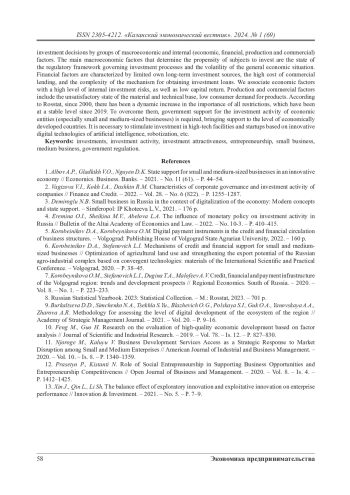 1. Альбов А.П., Гладких В.О., Нгуен Д.К. Государственная поддержка малого и среднего бизнеса в условиях инновационной экономики // Экономика. Бизнес. Банки. - 2021. - № 11 (61). - С. 44-54.