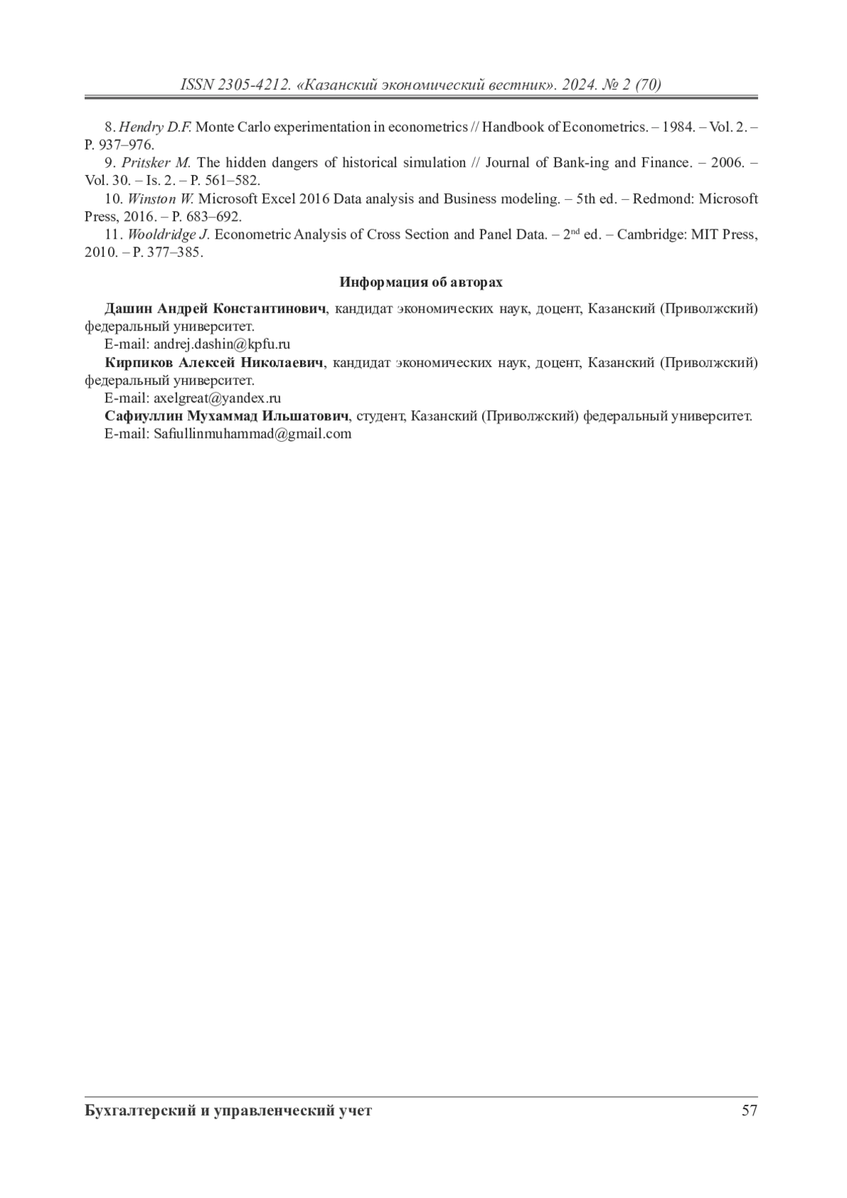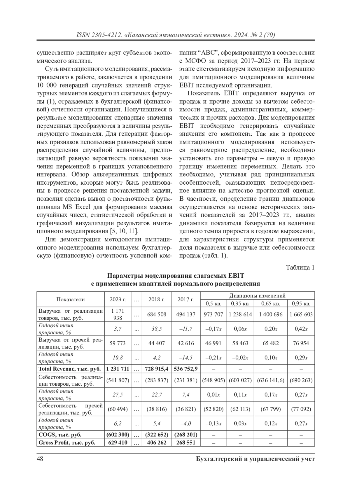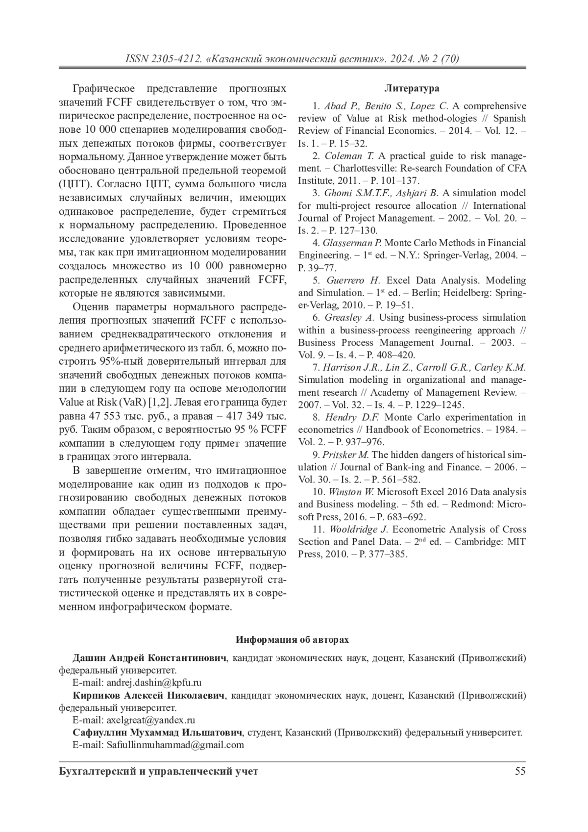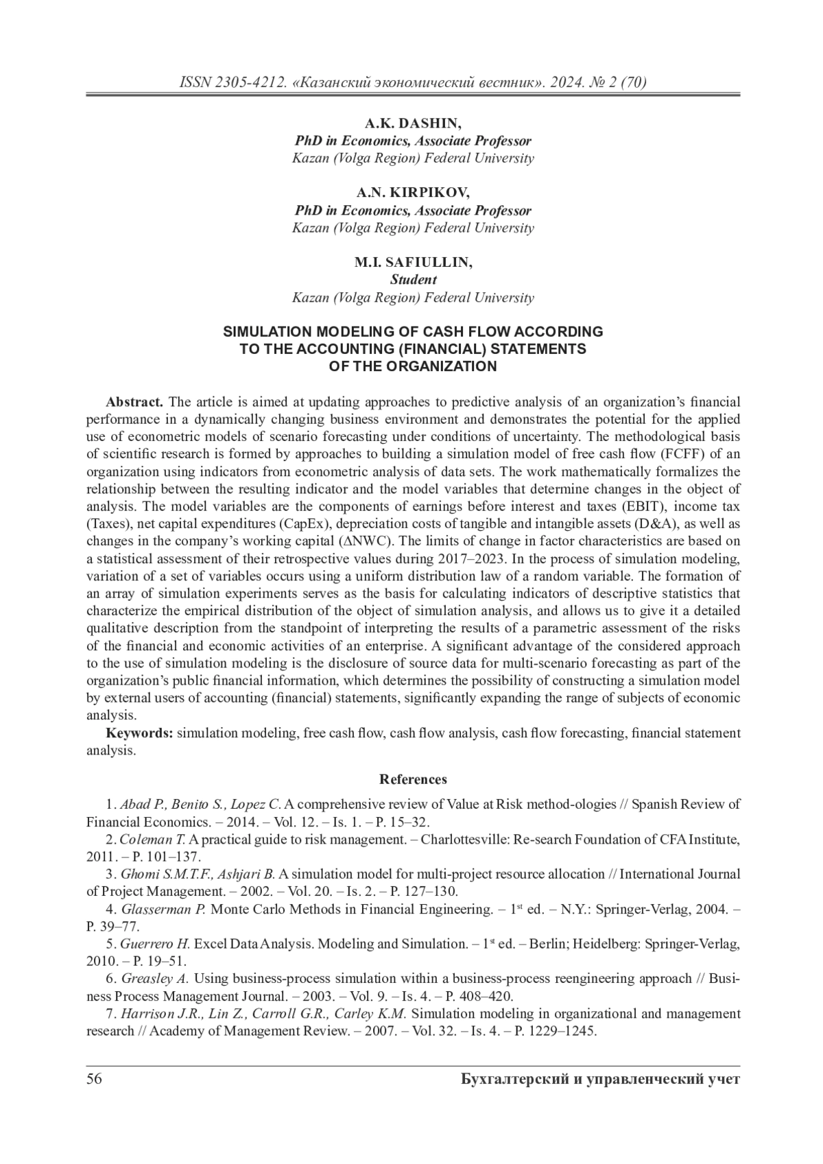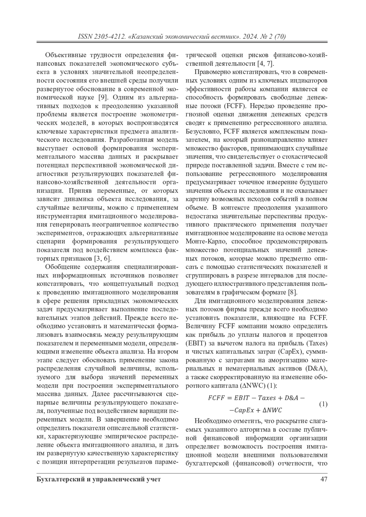 Статья направлена на актуализацию подходов к проведению прогнозного анализа финансовых показателей организации в динамично меняющейся бизнес-среде и демонстрирует потенциал прикладного применения эконометрических моделей сценарного прогнозирования в условиях неопределенности. Методический базис научного исследования формируют подходы к построению имитационной модели свободного денежного потока (FCFF) организации с применением показателей эконометрического анализа массивов данных. В работе математически формализована взаимосвязь между результирующим показателем и переменными модели, определяющими изменение объекта анализа. Переменными модели выступают слагаемые прибыли до уплаты налогов и процентов (EBIT), налог на прибыль (Taxes), чистые капитальные затраты (СapEx), расходы на амортизацию материальных и нематериальных активов (D&A), а также изменение оборотного капитала компании (∆NWC). Границы изменения факторных признаков базируются на статистической оценке их ретроспективных значений на протяжении 2017–2023 гг. В процессе имитационного моделирования вариация комплекса переменных происходит с применением равномерного закона распределения случайной величины. Формирование массива имитационных экспериментов выступает основой для расчета показателей описательной статистики, характеризующих эмпирическое распределение объекта имитационного анализа, и позволяет дать ему развернутую качественную характеристику с позиции интерпретации результатов параметрической оценки рисков финансово-хозяйственной деятельности предприятия. Существенным преимуществом рассматриваемого подхода к применению имитационного моделирования выступает раскрытие исходных данных для многосценарного прогнозирования в составе публичной финансовой информации организации, что определяет возможность построения имитационной модели внешними пользователями бухгалтерской (финансовой) отчетности, существенно расширяя круг субъектов экономического анализа.