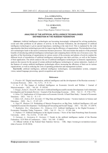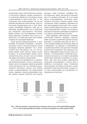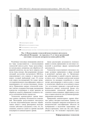 Технологии искусственного интеллекта получают все более широкое распространение для решения производственных, социальных и других задач во всех сферах деятельности. В Российской Федерации развитию технологий искусственного интеллекта придается особое значение, в том числе на государственном уровне. Это объясняется широкими возможностями, которые предоставляют данные технологии для повышения эффективности функционирования организаций. Внедрение любых новых технологий приводит к необходимости перестройки бизнес-процессов. Это, в свою очередь, вызывает как необходимость анализа потенциальных преимуществ от внедрения технологий искусственного интеллекта, так и необходимость их сопоставления с размерами ресурсных затрат. Специфика функционирования организаций в различных отраслях экономики и сферах деятельности объясняет разный уровень проникновения технологий искусственного интеллекта в их деятельность, а также особенности их применения. В статье проводится анализ использования технологий искусственного интеллекта в отечественных организациях, анализируются причины распространения тех или иных технологий искусственного интеллекта в различных отраслях. Результаты анализа особенностей различных технологий искусственного интеллекта позволят повысить эффективность их использования в различных организациях, а также снизить затраты на функционирование производственных и управленческих систем.
