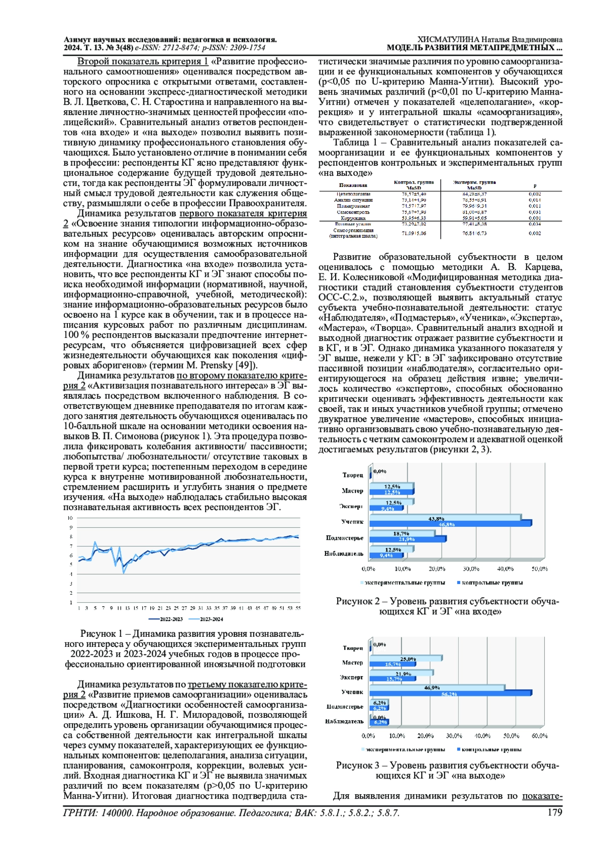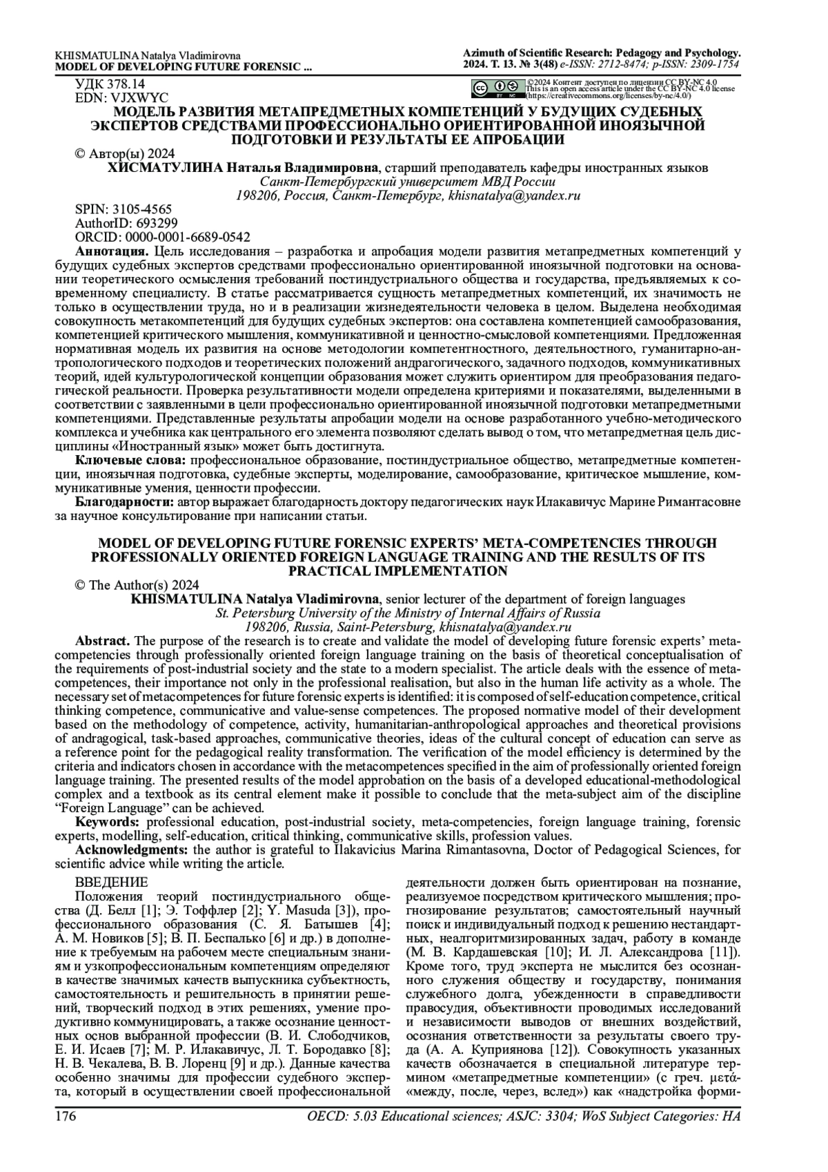 Цель исследования - разработка и апробация модели развития метапредметных компетенций у будущих судебных экспертов средствами профессионально ориентированной иноязычной подготовки на основании теоретического осмысления требований постиндустриального общества и государства, предъявляемых к современному специалисту. В статье рассматривается сущность метапредметных компетенций, их значимость не только в осуществлении труда, но и в реализации жизнедеятельности человека в целом. Выделена необходимая совокупность метакомпетенций для будущих судебных экспертов: она составлена компетенцией самообразования, компетенцией критического мышления, коммуникативной и ценностно-смысловой компетенциями. Предложенная нормативная модель их развития на основе методологии компетентностного, деятельностного, гуманитарно-антропологического подходов и теоретических положений андрагогического, задачного подходов, коммуникативных теорий, идей культурологической концепции образования может служить ориентиром для преобразования педагогической реальности. Проверка результативности модели определена критериями и показателями, выделенными в соответствии с заявленными в цели профессионально ориентированной иноязычной подготовки метапредметными компетенциями. Представленные результаты апробации модели на основе разработанного учебно-методического комплекса и учебника как центрального его элемента позволяют сделать вывод о том, что метапредметная цель дисциплины «Иностранный язык» может быть достигнута.