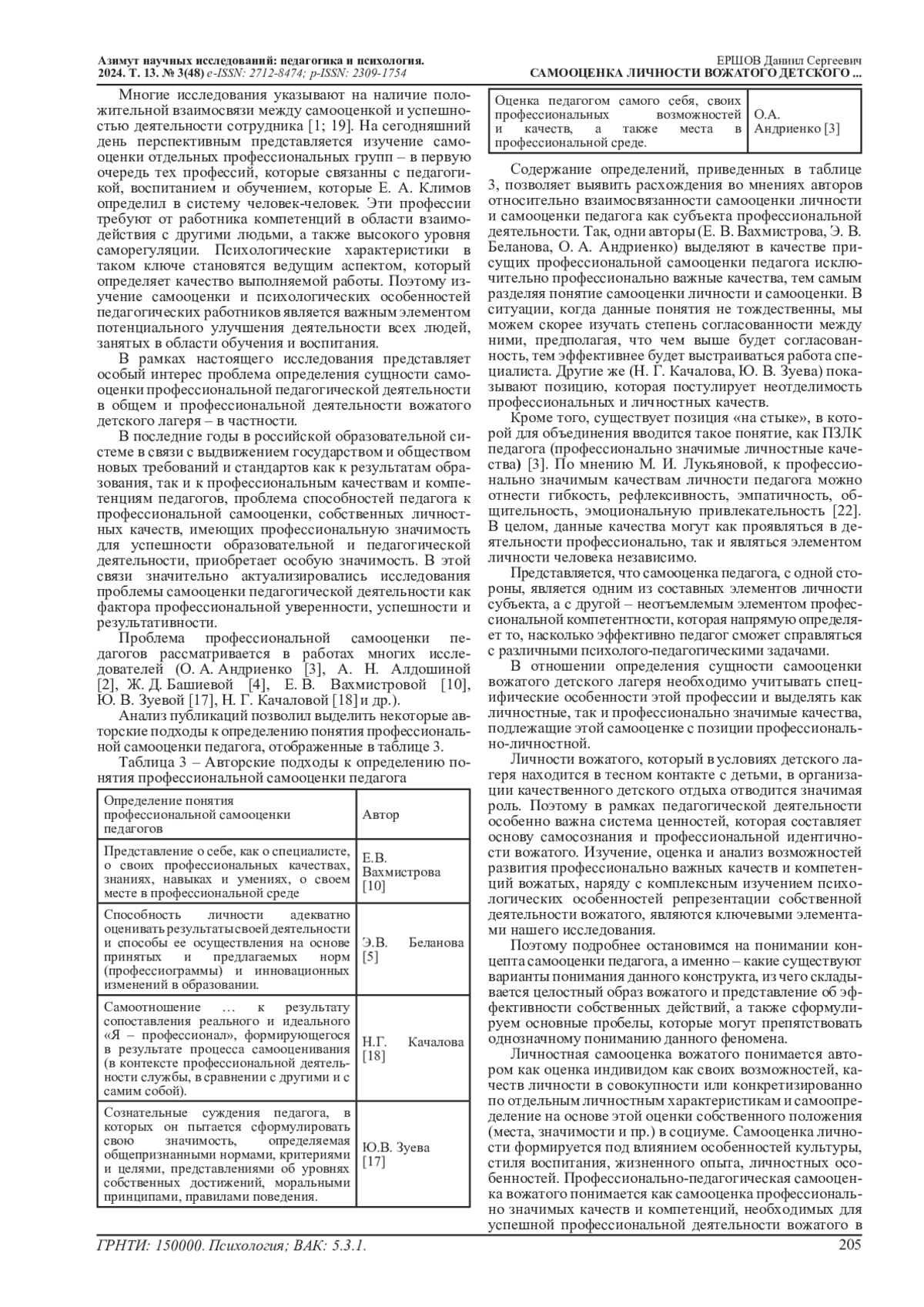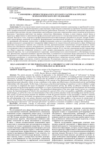 В статье представлен анализ подходов к определению понятия «самооценка» в зарубежной и отечественной психологии, проанализированы существующие теоретические концепции по проблеме изучения личностной и профессиональной самооценки педагогических работников. Показано, что проблема самооценки представлена множеством научных трудов, отражающих многообразие подходов к определению самого понятия исследуемого феномена. Самооценка выступает как важное личностное образование, которое, в свою очередь, вносит вклад в характер и эффективность выполнения профессиональной деятельности и построения взаимоотношений с другими людьми. Исходя из этого, в процессе профессиональной подготовки вожатых для работы в детских лагерях необходимо акцентировать внимание на вопросах формирования самооценочной активности, способности рефлексивного оценивания собственных личностных и профессиональных качеств и способностей как фактора личностного и профессионального саморазвития и повышения эффективности их педагогической деятельности. Дана обобщенная трактовка исследуемого термина как сложной системы, функциональным назначением которой является оценка личностью собственных качеств, возможностей, достоинств и недостатков, а также собственное определение своего положения и места в окружающем (ближнем и дальнем) социуме. В эту систему самооценки входит определение как общего характера отношения личности к себе, уровня самоуважения, целостного принятие/непринятие собственной персоны, так и детализированного характера, заключающегося в самоотношении к собственным поступкам, физическим, морально-волевым и др. качествам, к успешности в отдельных видах деятельности. На основе проведенного теоретического анализа определена позиция автора к содержанию понятий «профессионально-педагогическая самооценка» и «личностная самооценка» - применительно к вожатым детских лагерей.