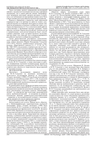 В статье обсуждаются историко-психологические исследования в области зоопсихологии и сравнительной психологии. Обозначается специальная категория ученых, которые занимались этими вопросами, - психологи-эмигранты, представители российского психологического зарубежья. Особенность этой группы ученых заключается в том, что в своем творчестве некоторые из них сочетали российские и мировые (той страны, в которую они эмигрировали) научные традиции. Авторы статьи обращаются к творчеству биолога и сравнительного психолога М. И. Гольдсмит (1871-1933), которая эмигрировала во Францию и построила там научную карьеру. Проводится историко-психологический анализ ее представлений об эволюции психики на материале книги «Теории эволюции» (1909/1913), подготовленной в соавторстве с ее научным руководителем, французским зоологом И. Делажем. Обсуждаются библиографические (коллективное авторство монографии), проблемологические (ее эволюционные взгляды) и сравнительно-сопоставительные (сравнение с существовавшими в тот период эволюционно-психологическими исследованиями) аспекты изучения ее позиции по вопросу эволюции психического. Делается вывод о том, что данная монография представляла собой историко-научный обзор эволюционных учений, без представления авторами собственных исследований. Новизной книги И. Делажа и М. И. Гольдсмит являлось рассмотрение достаточно широкого перечня концепций и авторов по этой проблематике, однако свои взгляды в книге они представили не детально. На основе анализа монографии обосновывается, что М. И. Гольдсмит придерживалась эволюционного подхода в своих исследованиях. Утверждается, что подобные историко-психологические исследования отдельных работ ученых выполняют историографическую функцию - фиксируют проблематику исследований конкретного автора и исторического периода.