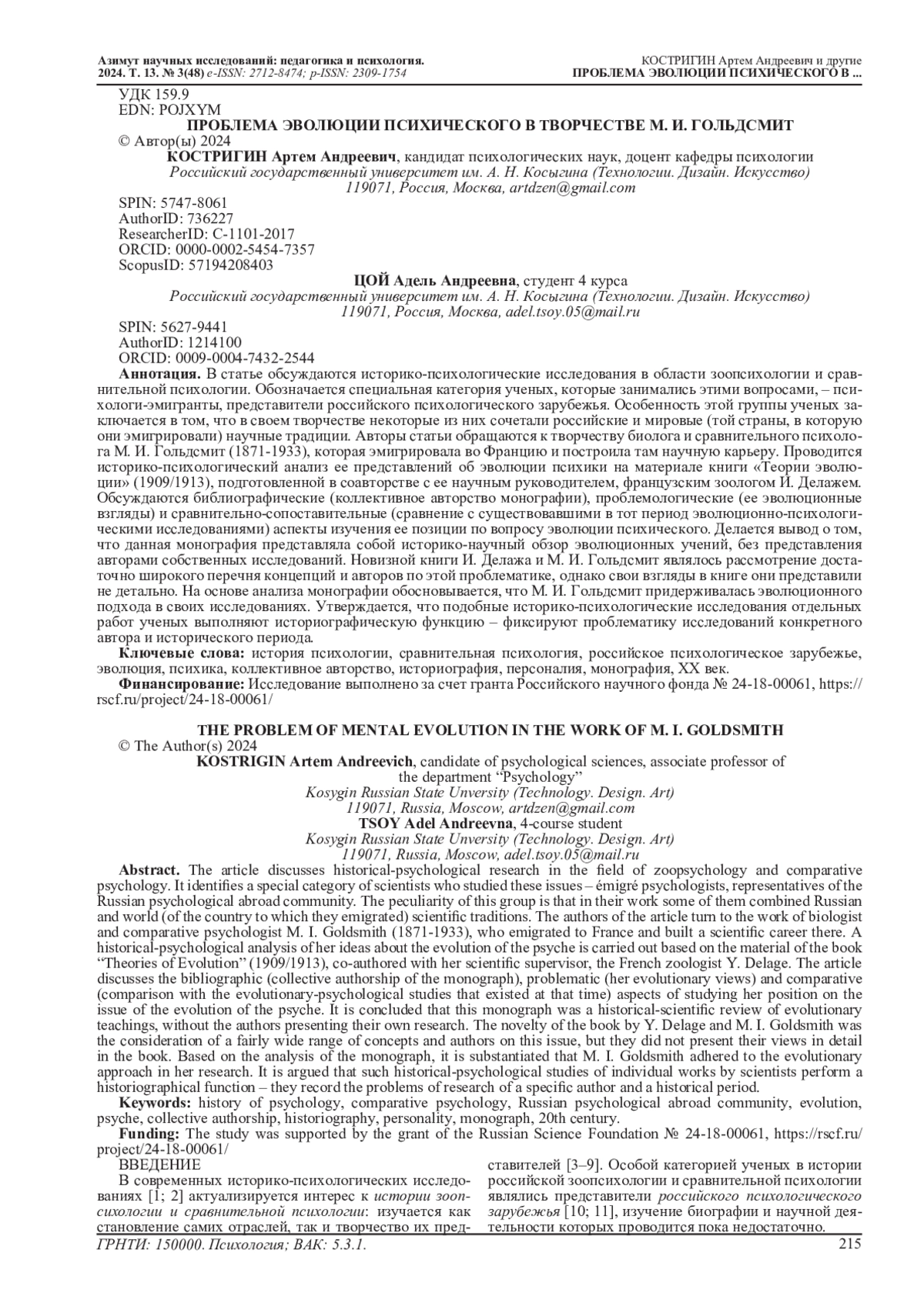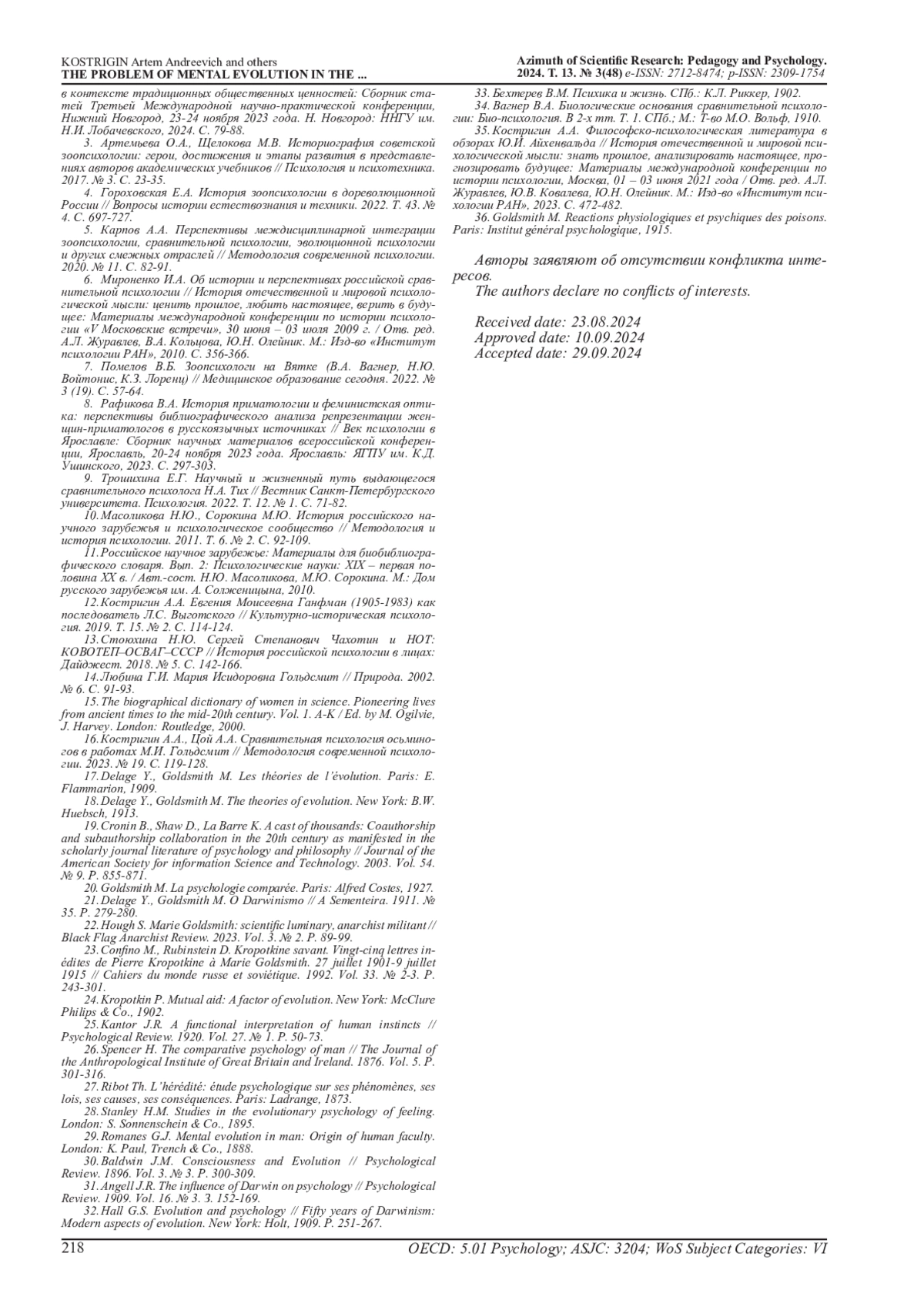 16. Костригин А.А., Цой А.А. Сравнительная психология осьминогов в работах М.И. Гольдсмит // Методология современной психологии. 2023. № 19. С. 119-128. EDN: WZPJKC