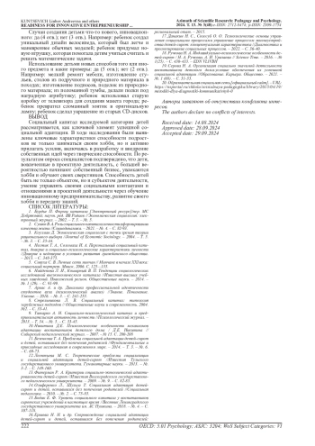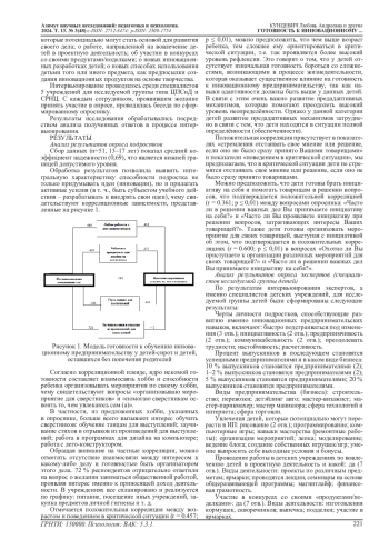 Результат: выявлена совокупность характеристик искомой готовности, включающая: 1) наличие устойчивого хобби (увлечения); 2) способность обучать данному хобби сверстников; 3) способность управлять своими социальными контактами и отношениями в проектной деятельности.