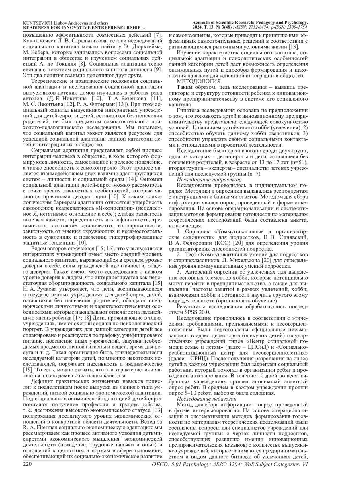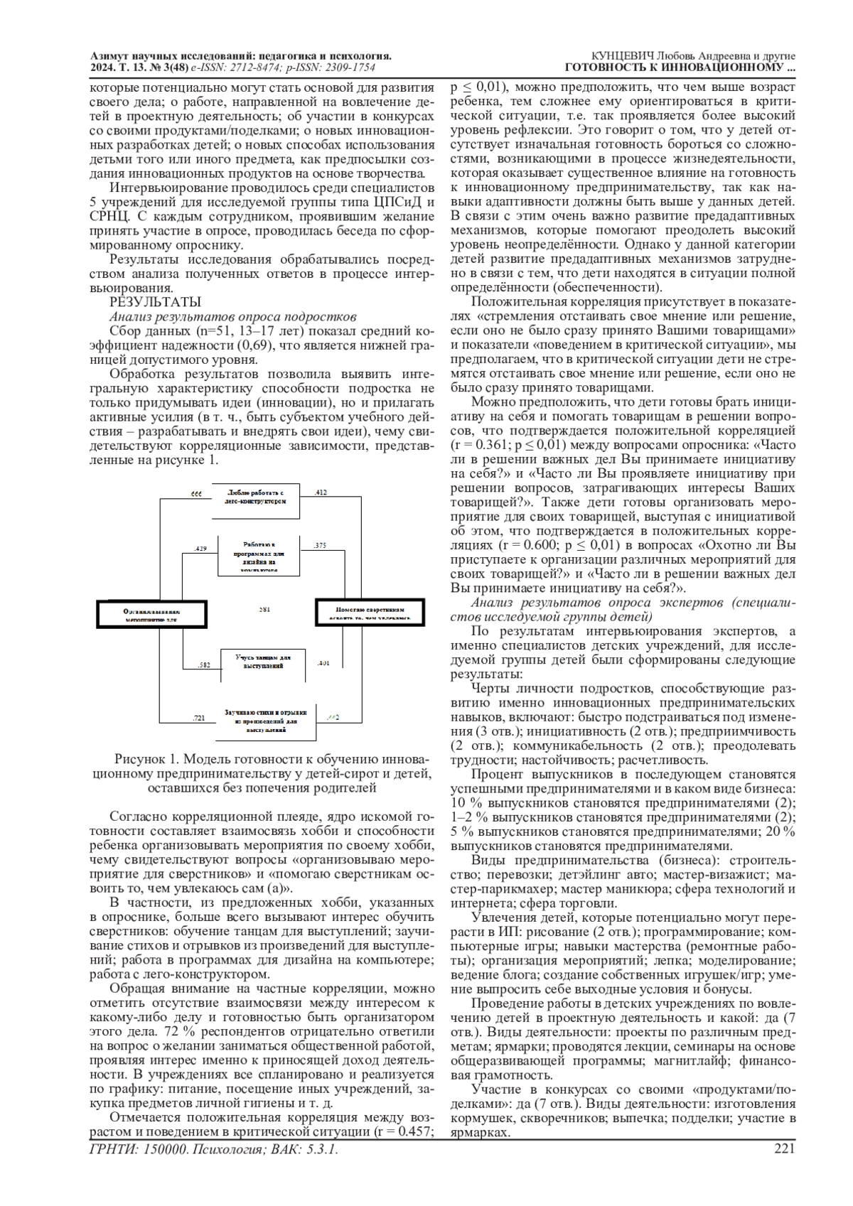 Методы исследования: анкетный опрос детей, экспертный опрос специалистов, работающих с такими детьми, корреляционный анализ, систематизация ответов экспертного опроса. Разработан диагностический инструментарий с авторским блоком для выявления готовности у детей-сирот и детей, оставшихся без попечения родителей к инновационному предпринимательству.