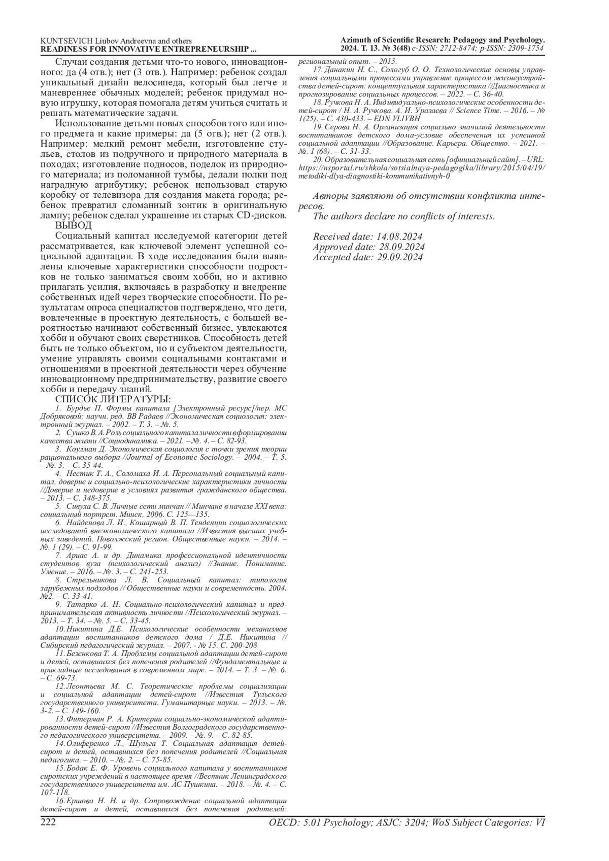 15. Бодак Е. Ф. Уровень социального капитала у воспитанников сиротских учреждений в настоящее время //Вестник Ленинградского государственного университета им. АС Пушкина. - 2018. - №. 4. - С. 107-118. EDN: VSOJNX