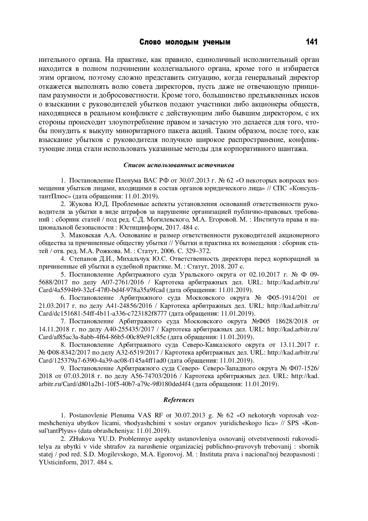 1. Постановление Пленума ВАС РФ от 30.07.2013 г. № 62 «О некоторых вопросах возмещения убытков лицами, входящими в состав органов юридического лица» // СПС «КонсультантПлюс» (дата обращения: 11.01.2019).