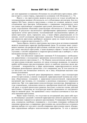 В статье автор рассматривает важнейший компонент криминалистической характеристики мошенничества в сфере кредитования – личность преступника. Обосновывая практическую значимость формирования представления о психологических качествах мошенника, совершающего одно из наиболее сложных с точки зрения расследования экономических преступлений, автор выделяет общие черты, свойственные корыстным преступникам, а также представляет некоторые особенности различных типов кредитных мошенников. Кроме того, в статье предлагаются практические рекомендации получения сведений о социально-психологических качествах личности преступника посредством анализа поведения, что способствует повышению эффективности расследования рассматриваемого вида преступлений