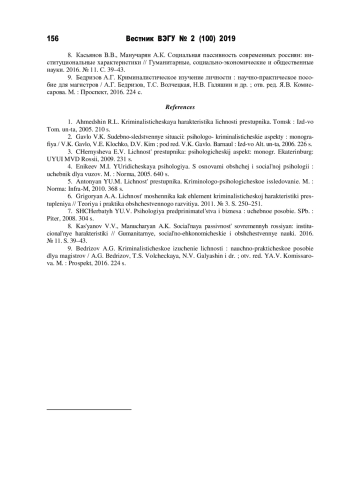 9. Бедризов А.Г. Криминалистическое изучение личности: научно-практическое пособие для магистров / А.Г. Бедризов, Т.С. Волчецкая, Н.В. Галяшин и др.; отв. ред. Я.В. Комиссарова. М.: Проспект, 2016. 224 с. EDN: PNYEQP