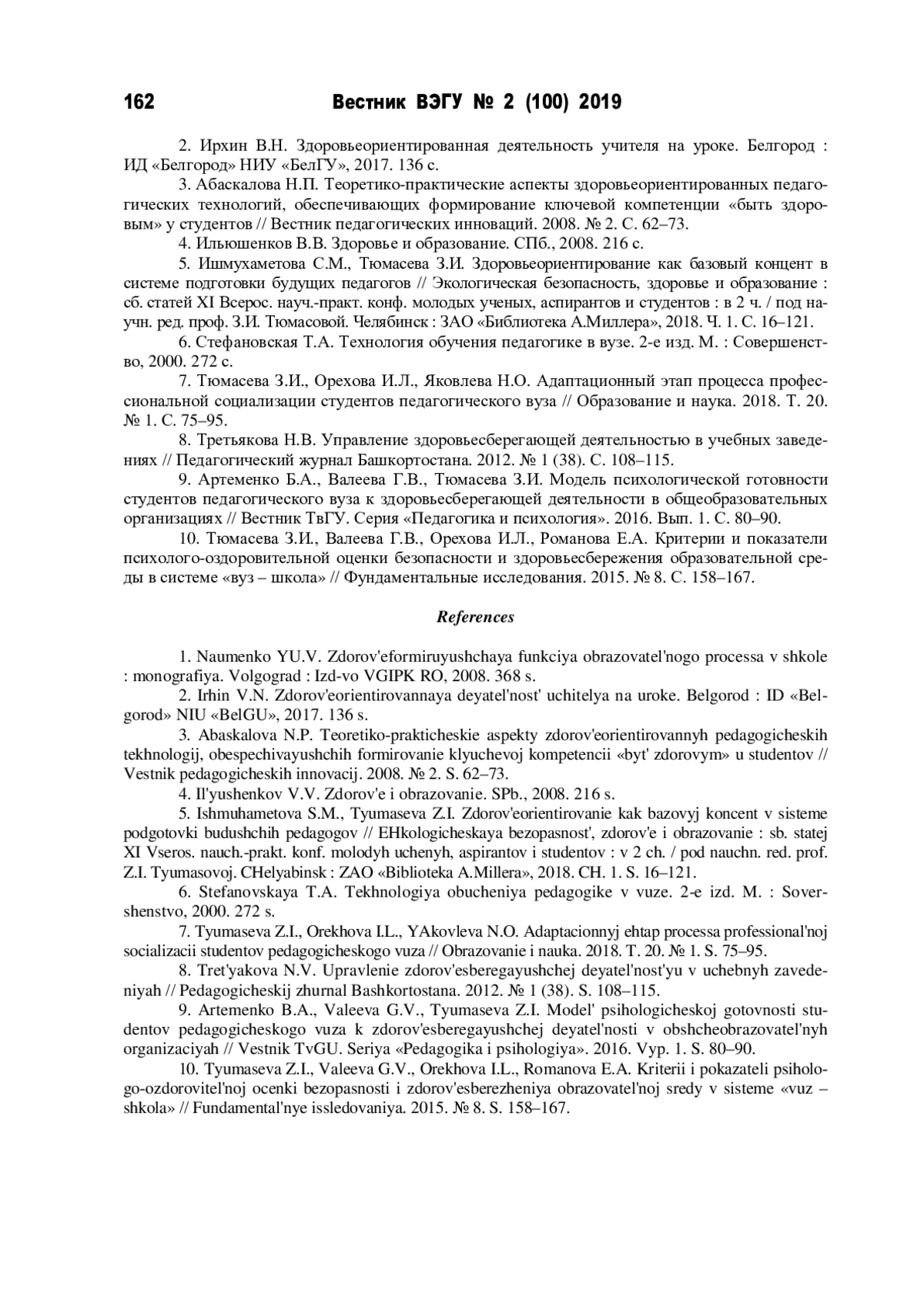 5. Ишмухаметова С.М., Тюмасева З.И. Здоровьеориентирование как базовый концент в системе подготовки будущих педагогов // Экологическая безопасность, здоровье и образование: сб. статей XI Всерос. науч.-практ. конф. молодых ученых, аспирантов и студентов: в 2 ч. / под научн. ред. проф. З.И. Тюмасовой. Челябинск: ЗАО «Библиотека А.Миллера», 2018. Ч. 1. С. 16-121. EDN: OSPNOZ