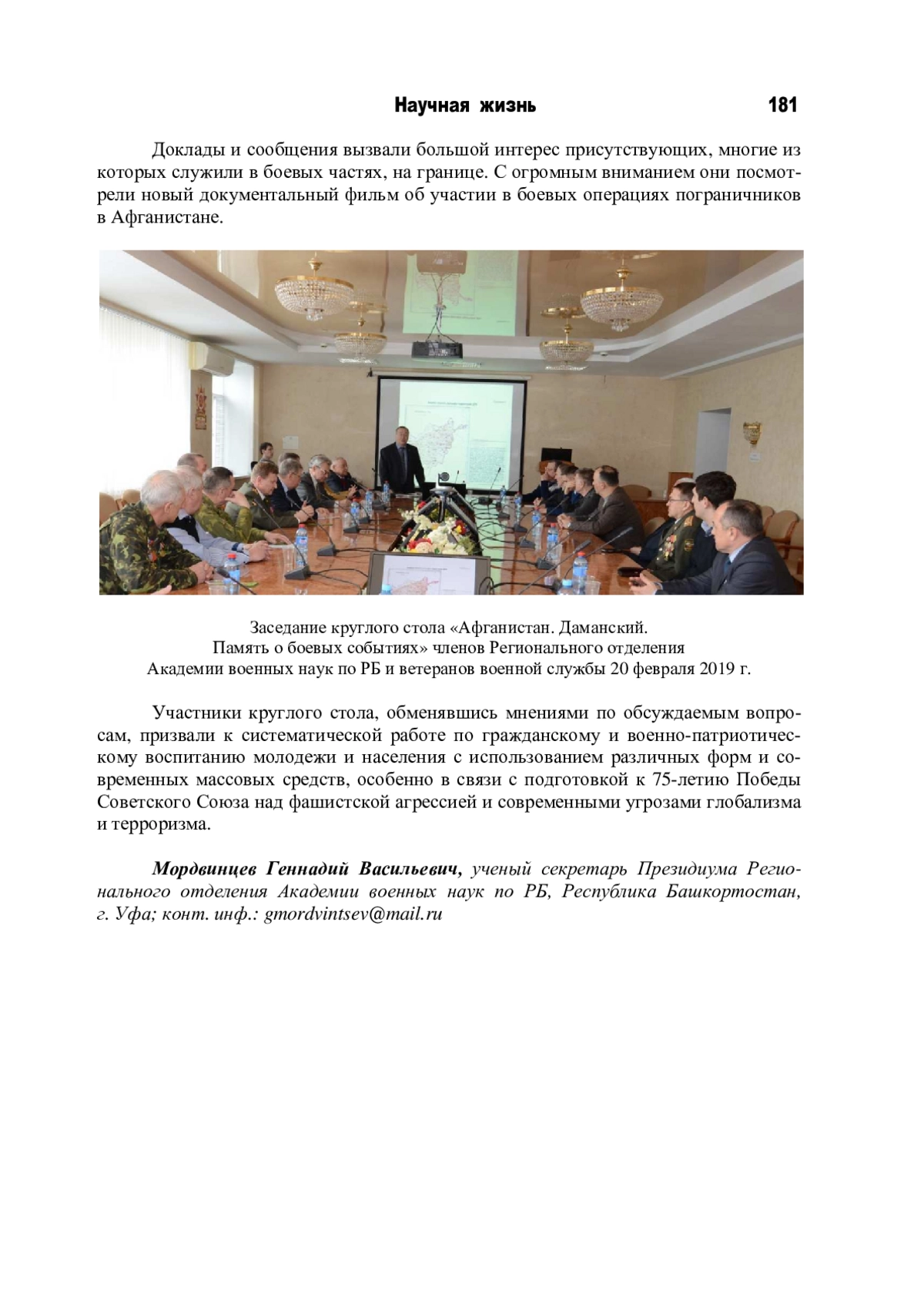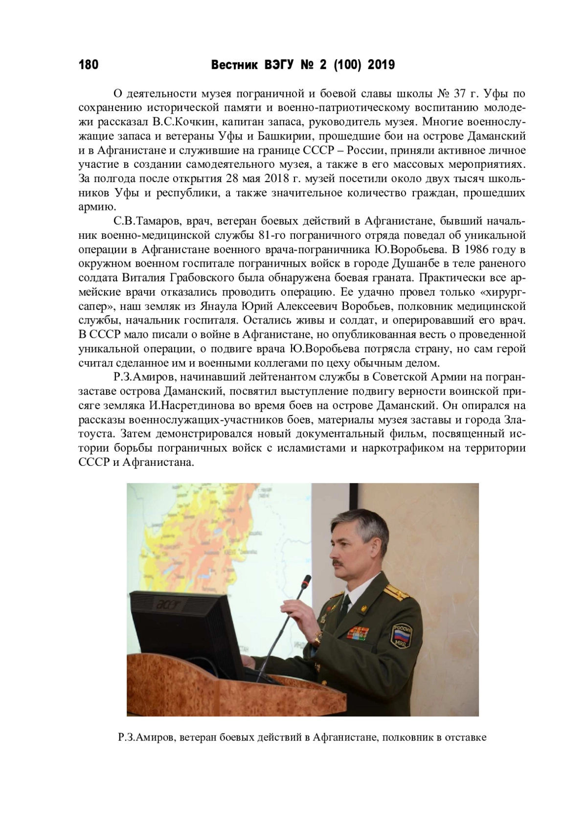 Двадцатого февраля 2019 г. на базе Академии ВЭГУ прошел круглый стол, посвященный 50-летию боев на острове Даманский и 30-летию завершения спецоперации советских войск в Афганистане. Его организаторами выступили Региональное отделение Академии военных наук по РБ, Музей пограничной и боевой славы средней школы No 37 г. Уфы, отделение Общества ветеранов-афганцев «Боевое братство» и ветеранские организации республики и Уфы. Вел заседание полковник запаса, профессор Академии военных наук А. В. Клюев