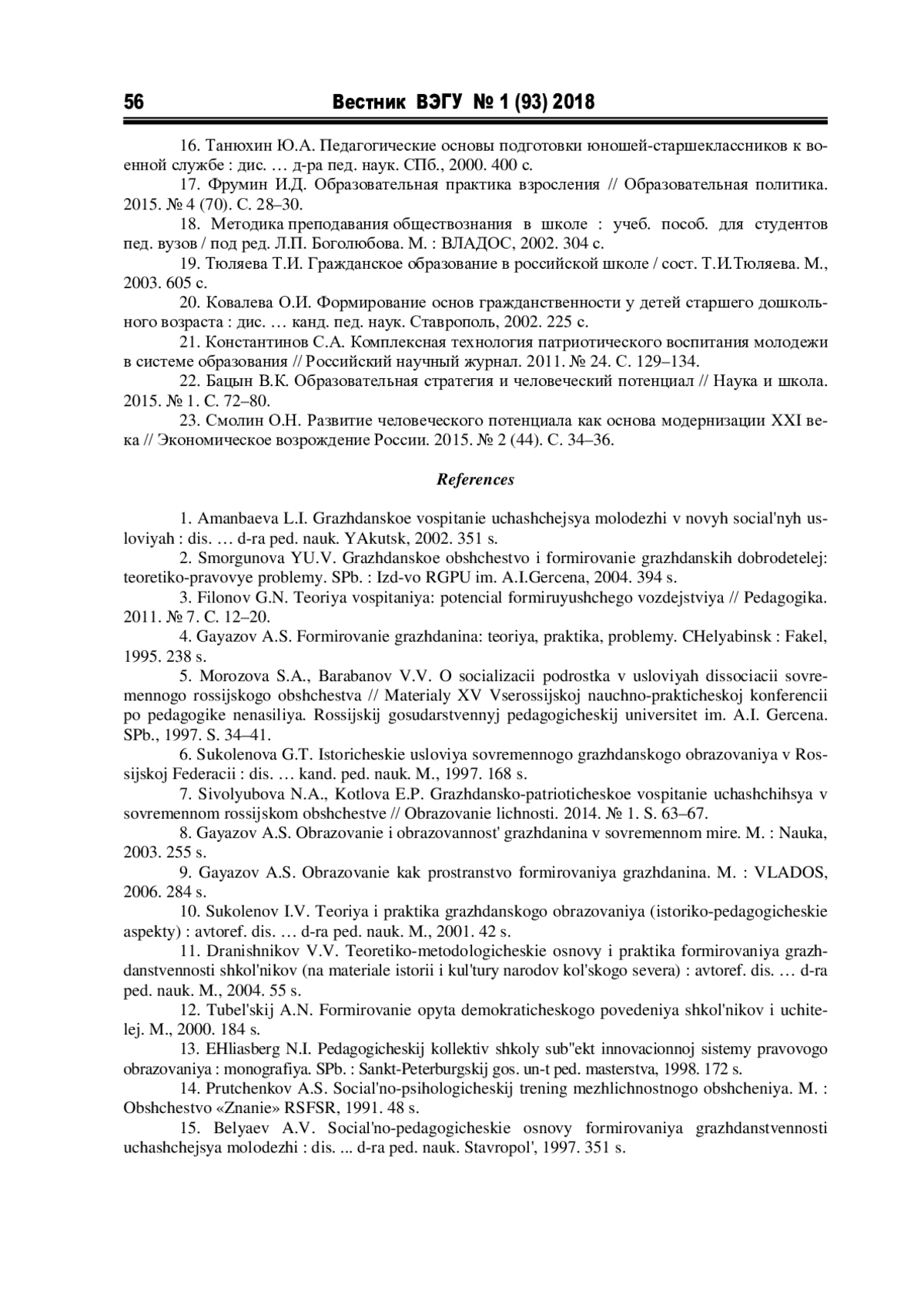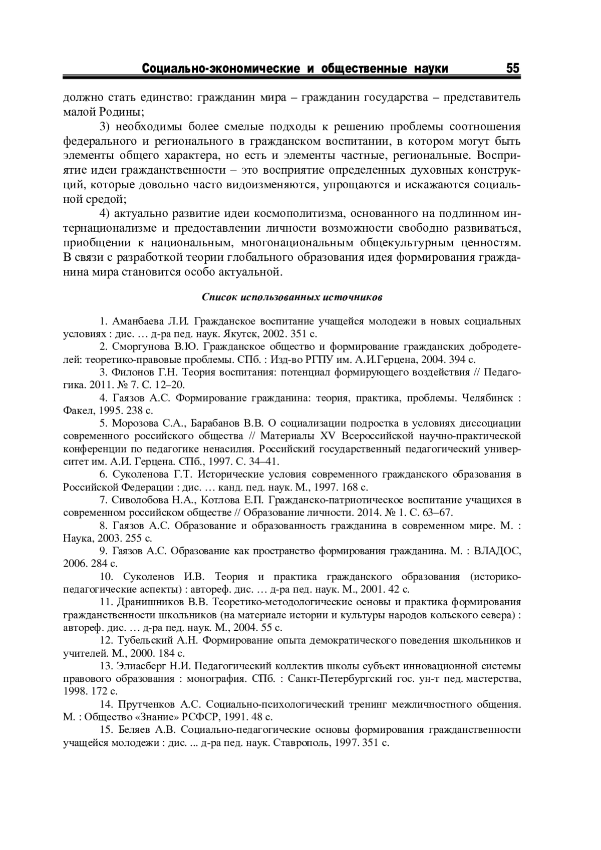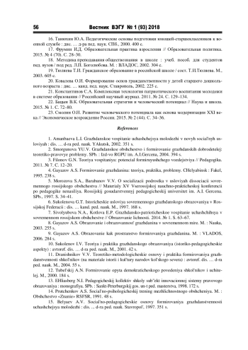 1. Аманбаева Л.И. Гражданское воспитание учащейся молодежи в новых социальных условиях: дис. … д-ра пед. наук. Якутск, 2002. 351 с. EDN: NMAKLD