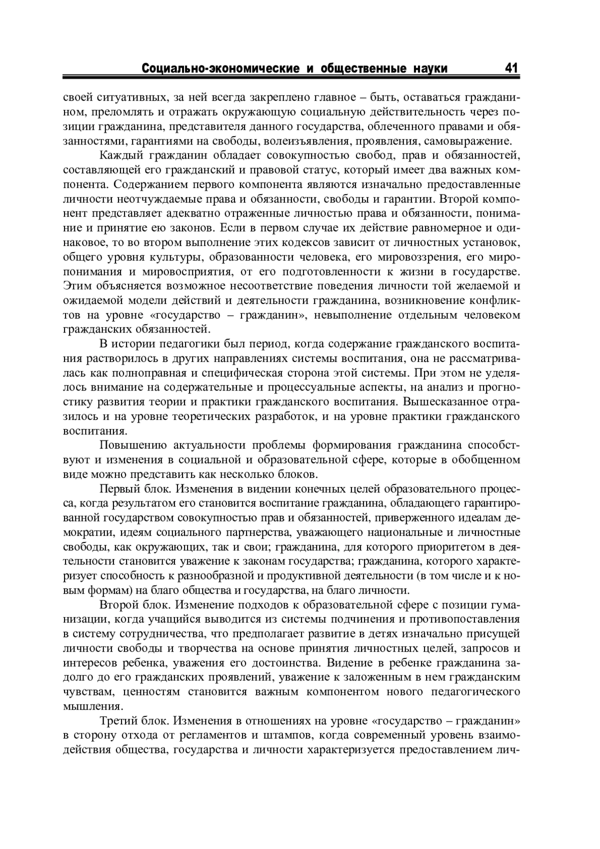 Среди большого количества проблем образования есть такие, от разработанности которых зависит судьба взаимоотношений личности и общества, человека и общества, гражданина и государства. Именно от их решения зачастую зависит комфорт и полнота самочувствия в отношениях человека с государством. Если до недавнего времени считалось, что в отношениях «человек – государство» приоритет принадлежит государству, то сегодня на первый план выходит человек со своими запросами, со своими претензиями на права и свободы. Однако традиции этатизированного государства все еще сильны, и государство осуществляет свою экспансию во многие сферы жизни.