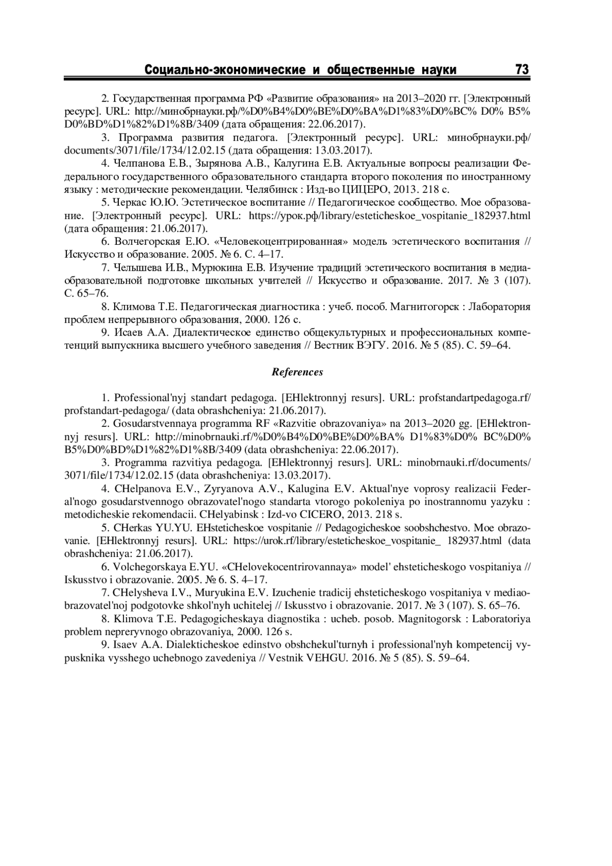 7. Челышева И.В., Мурюкина Е.В. Изучение традиций эстетического воспитания в медиаобразовательной подготовке школьных учителей // Искусство и образование. 2017. № 3 (107). С. 65-76. EDN: YNVTGB