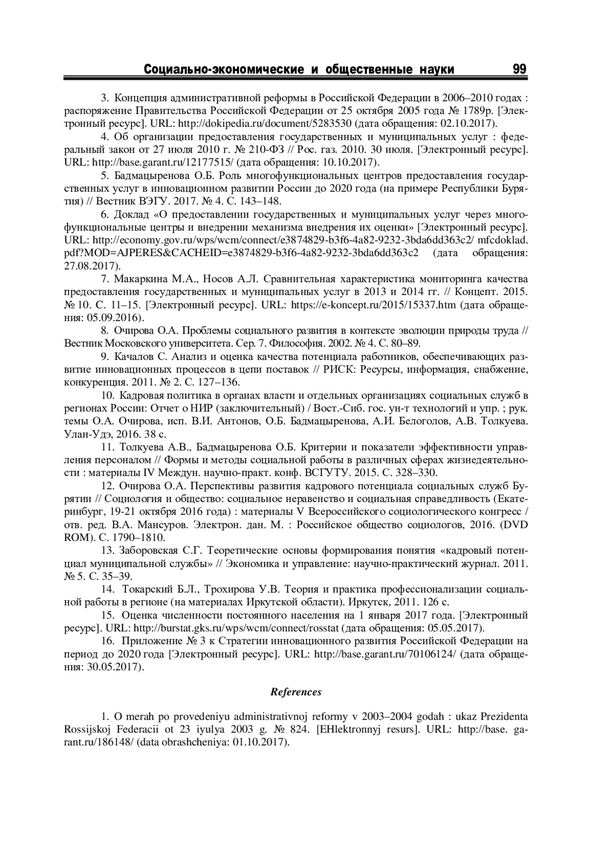 5. Бадмацыренова О.Б. Роль многофункциональных центров предоставления государственных услуг в инновационном развитии России до 2020 года (на примере Республики Бурятия) // Вестник ВЭГУ. 2017. № 4. С. 143-148. EDN: ZDAYYN