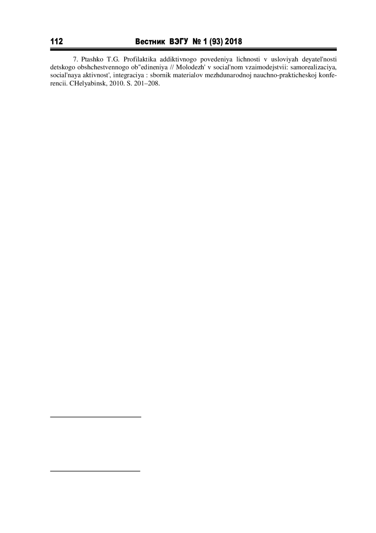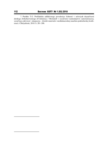7. Пташко Т.Г. Профилактика аддиктивного поведения личности в условиях деятельности детского общественного объединения//Молодежь в социальном взаимодействии: самореализация, социальная активность, интеграция: сборник материалов международной научно-практической конференции. Челябинск, 2010. С. 201-208. EDN: TVVJTZ