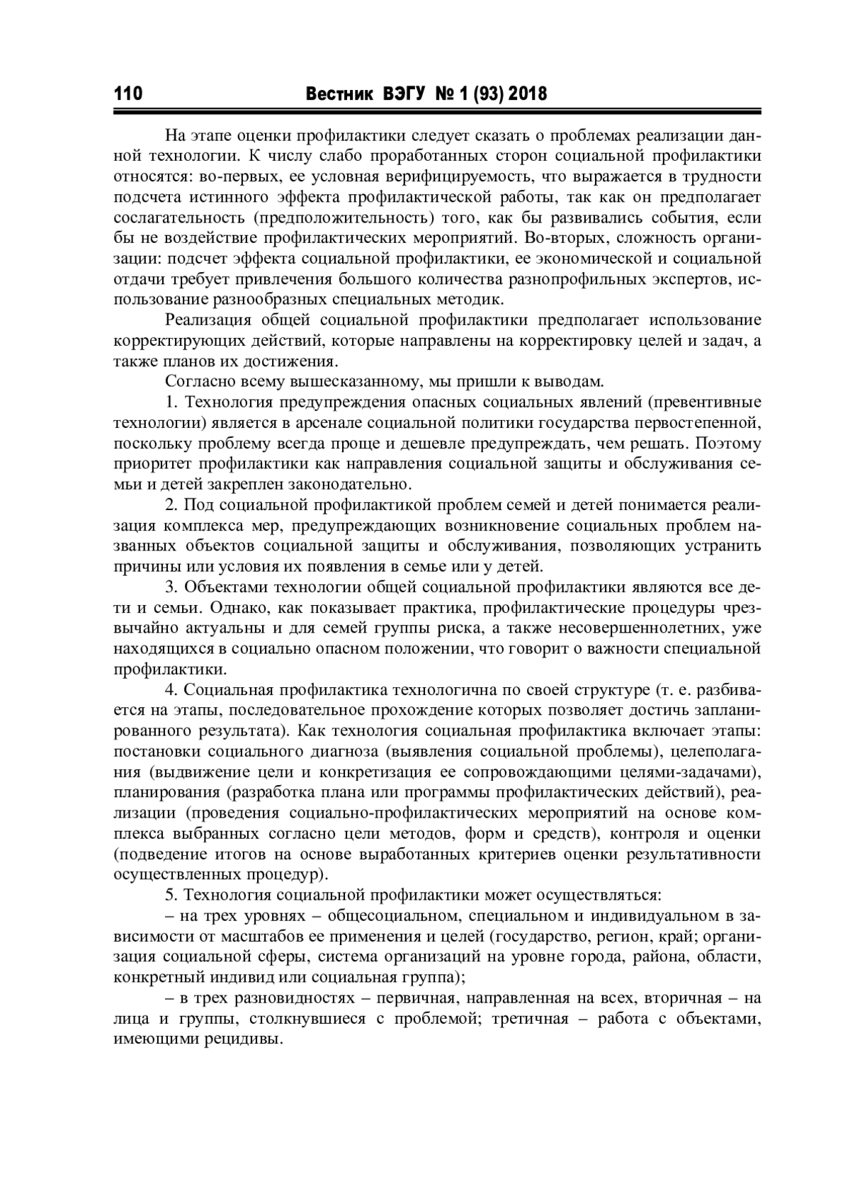 Социальная защита и обслуживание семей и детей в настоящее время реализуется за счет разных технологий социальной работы, особое место среди которых занимает социальная профилактика, поскольку направлена на предупреждение возникающих в обществе проблем. Учитывая, что научный поиск чаще всего обращен к раскрытию сущности и выявлению характеристик социальной профилактики (М. А. Галагузова [1], М. В. Фирсов [2], Е. И. Холостова [3; 4], М. В. Шакурова [5] и др.), в рамках данной статьи мы хотели бы уделить внимание ее технологической стороне, рассмотрев особенности реализации: последовательность этапов, их содержательное наполнение