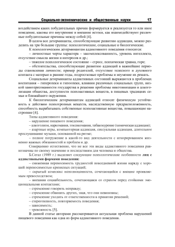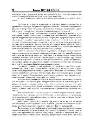 В статье отражен анализ социально-психологических детерминант аддикции людей на примере их пищевого поведения. Выделены психологические особенности лиц с аддиктивными формами поведения. Обоснована социальная значимость проблемы избыточного веса и ожирения. Рассмотрена динамика отношения общества к проблеме избыточного веса в историческом аспекте. Представлены результаты психодиагностического исследования женщин с избыточным весом