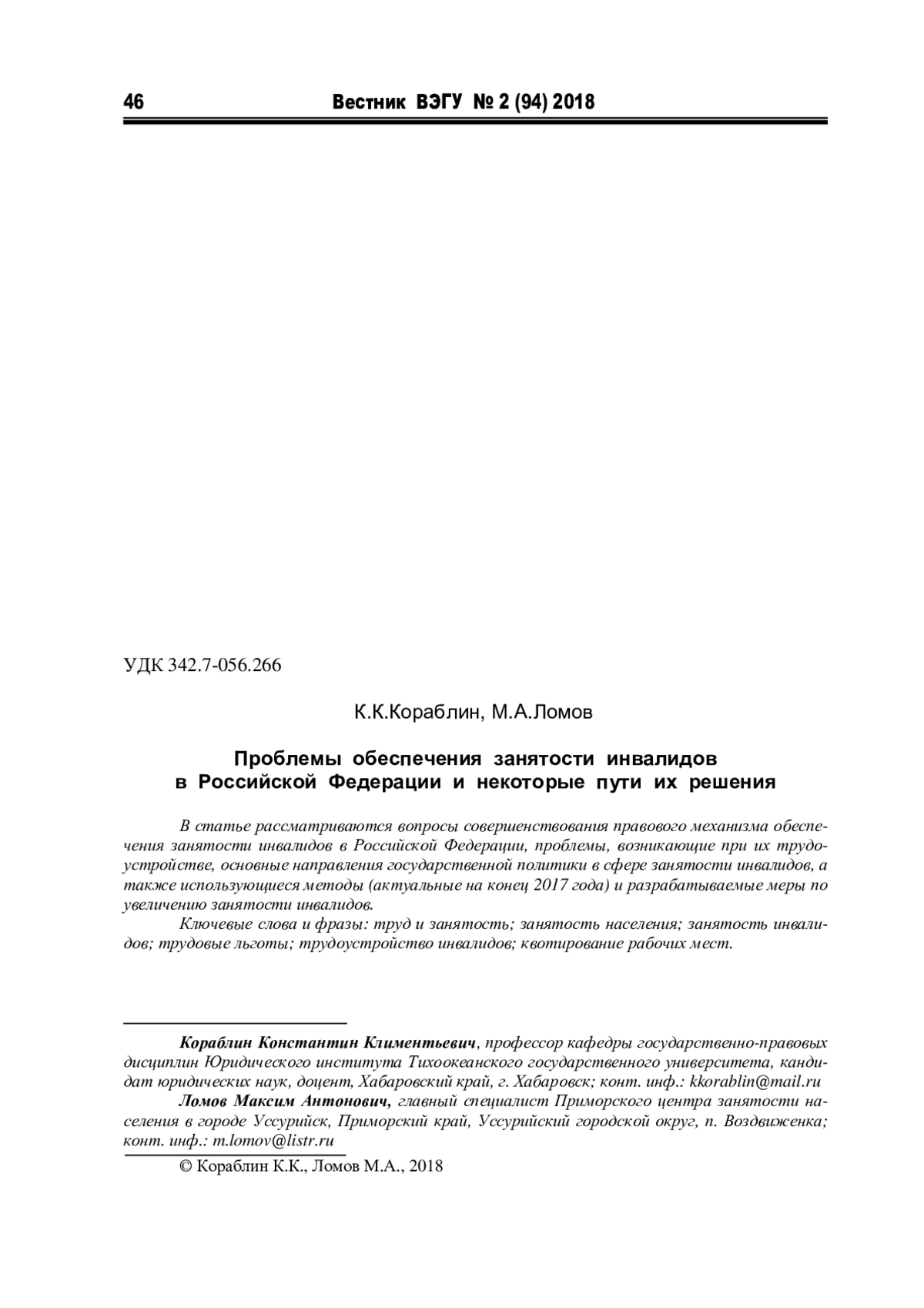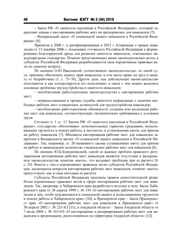 9. Корсаненкова Ю.Б. Квотирование рабочих мест для инвалидов: проблемы правового регулирования // Трудовое право в России и за рубежом. 2010. № 2. С. 23-27. EDN: NTDAZT