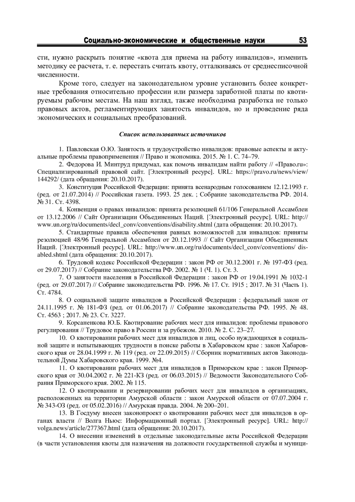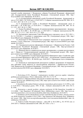 1. Павловская О.Ю. Занятость и трудоустройство инвалидов: правовые аспекты и актуальные проблемы правоприменения // Право и экономика. 2015. № 1. С. 74-79. EDN: TLIUOR