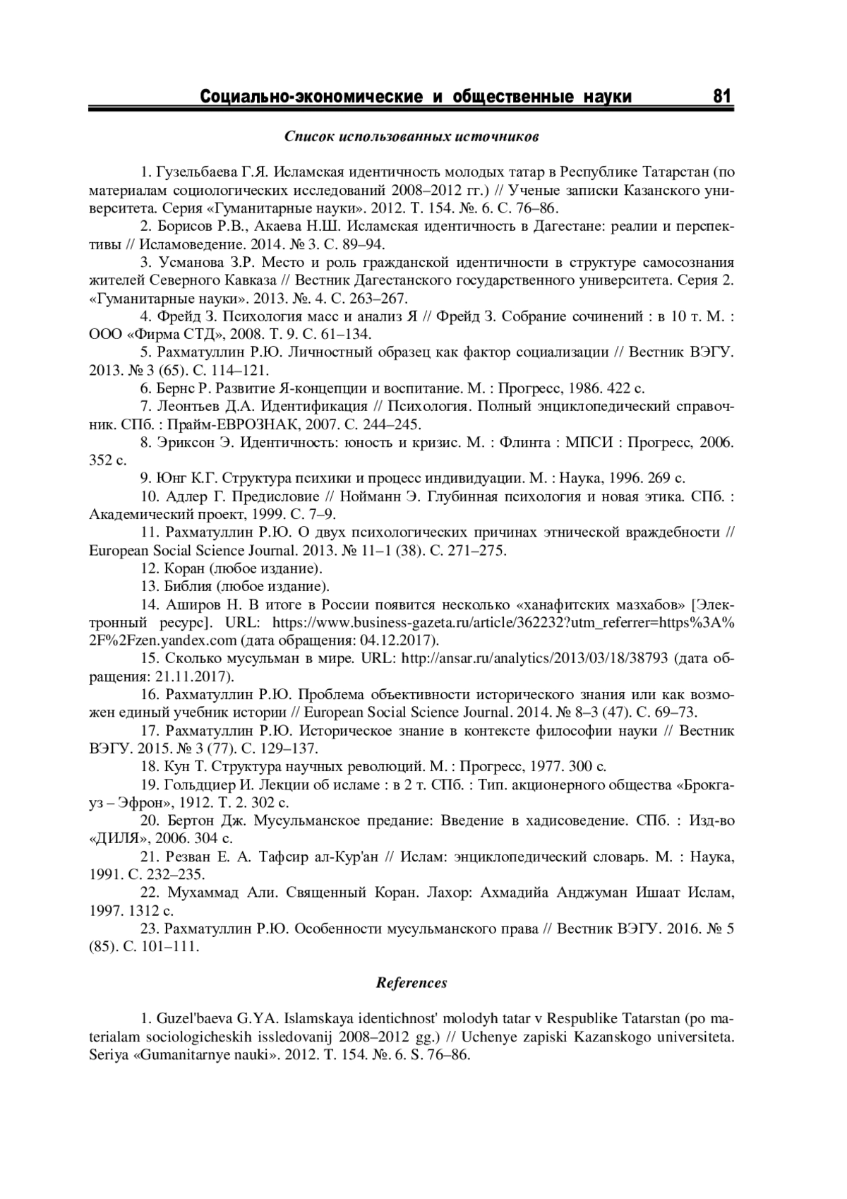 1. Гузельбаева Г.Я. Исламская идентичность молодых татар в Республике Татарстан (по материалам социологических исследований 2008-2012 гг.) // Ученые записки Казанского университета. Серия «Гуманитарные науки». 2012. Т. 154. №. 6. С. 76-86. EDN: PUUPWR