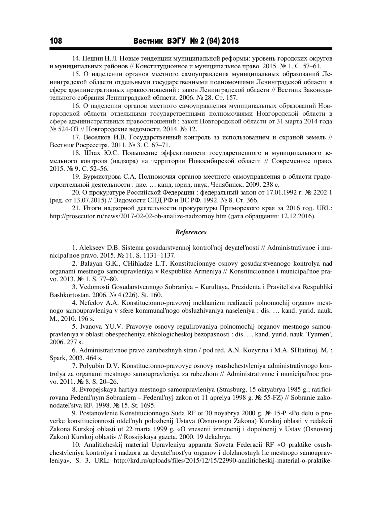 17. Веселков И.В. Государственный контроль за использованием и охраной земель // Вестник Росреестра. 2011. № 3. С. 67-71.