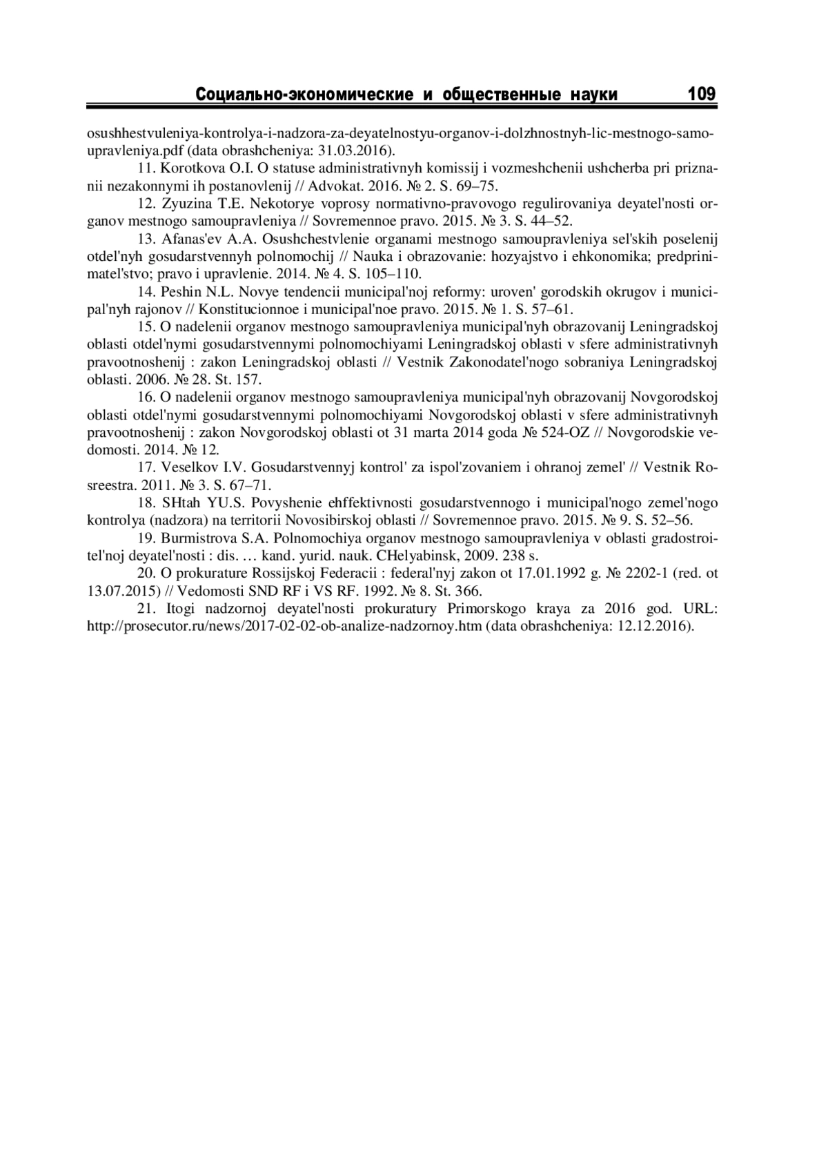 10. Аналитический материал Управления аппарата Совета Федерации РФ “О практике осуществления контроля и надзора за деятельностью органов и должностных лиц местного самоуправления”. С. 3. URL: http://krd.ru/uploads/files/2015/12/15/22990-analiticheskij-material-o-praktike-osushhestvuleniya-kontrolya-i-nadzora-za-deyatelnostyu-organov-i-dolzhnostnyh-lic-mestnogo-samoupravleniya.pdf (дата обращения: 31.03.2016).