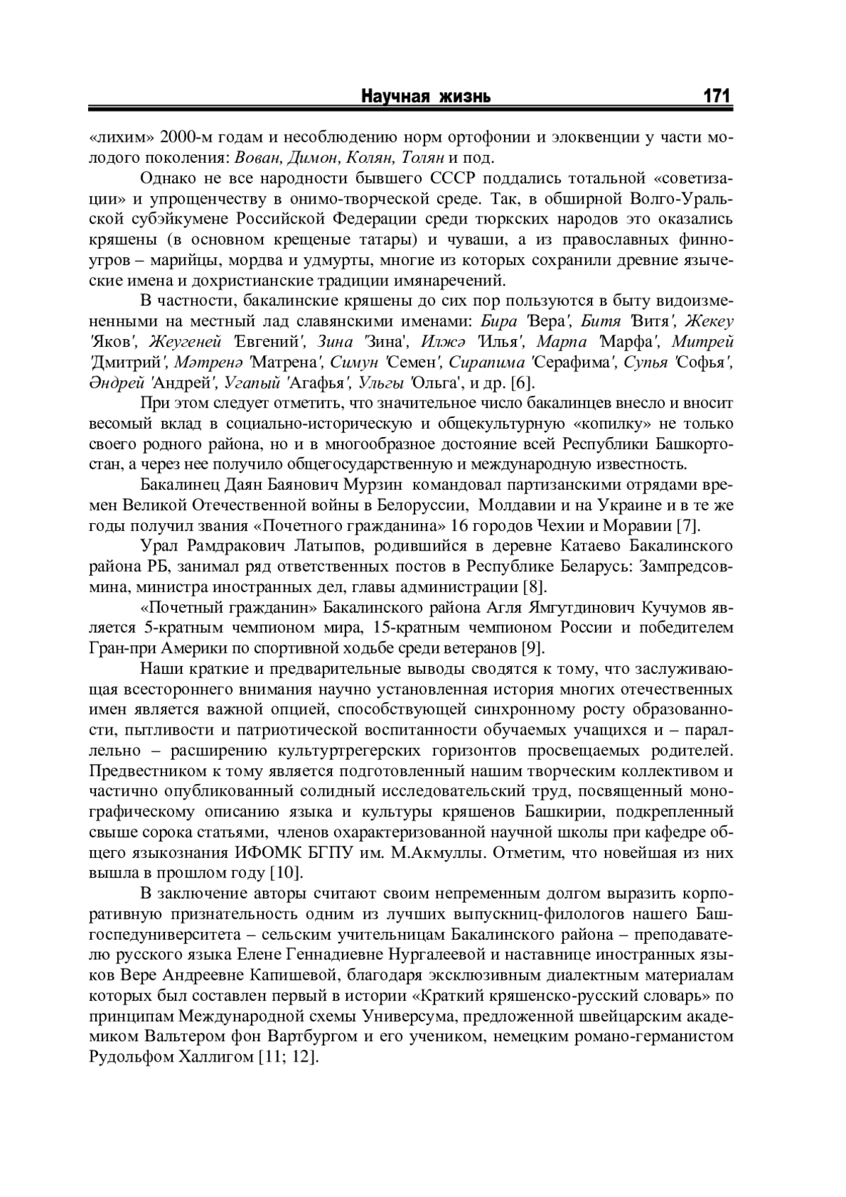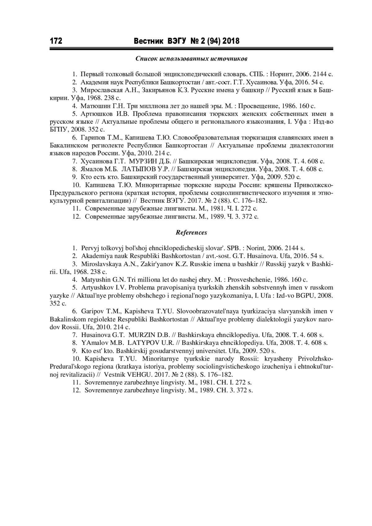 6. Гарипов Т.М., Капишева Т.Ю. Словообразовательная тюркизация славянских имен в Бакалинском региолекте Республики Башкортостан // Актуальные проблемы диалектологии языков народов России. Уфа, 2010. 214 c.