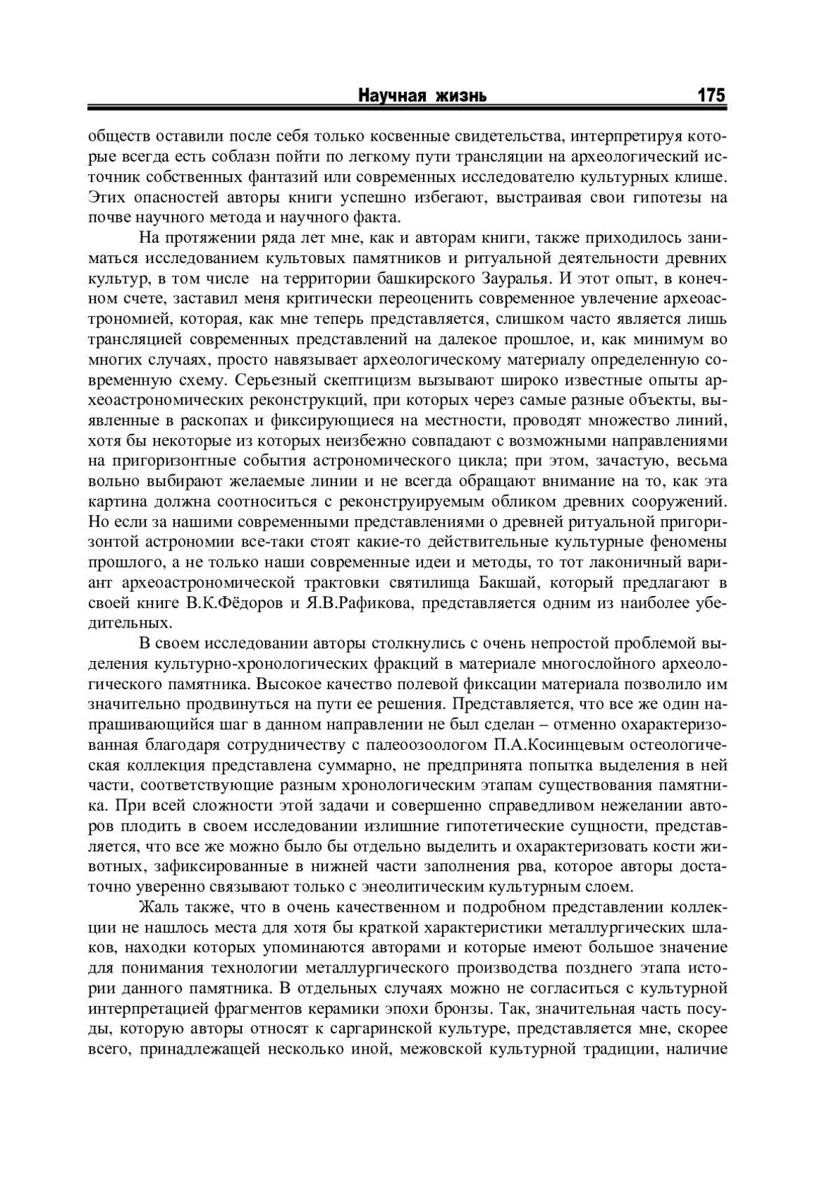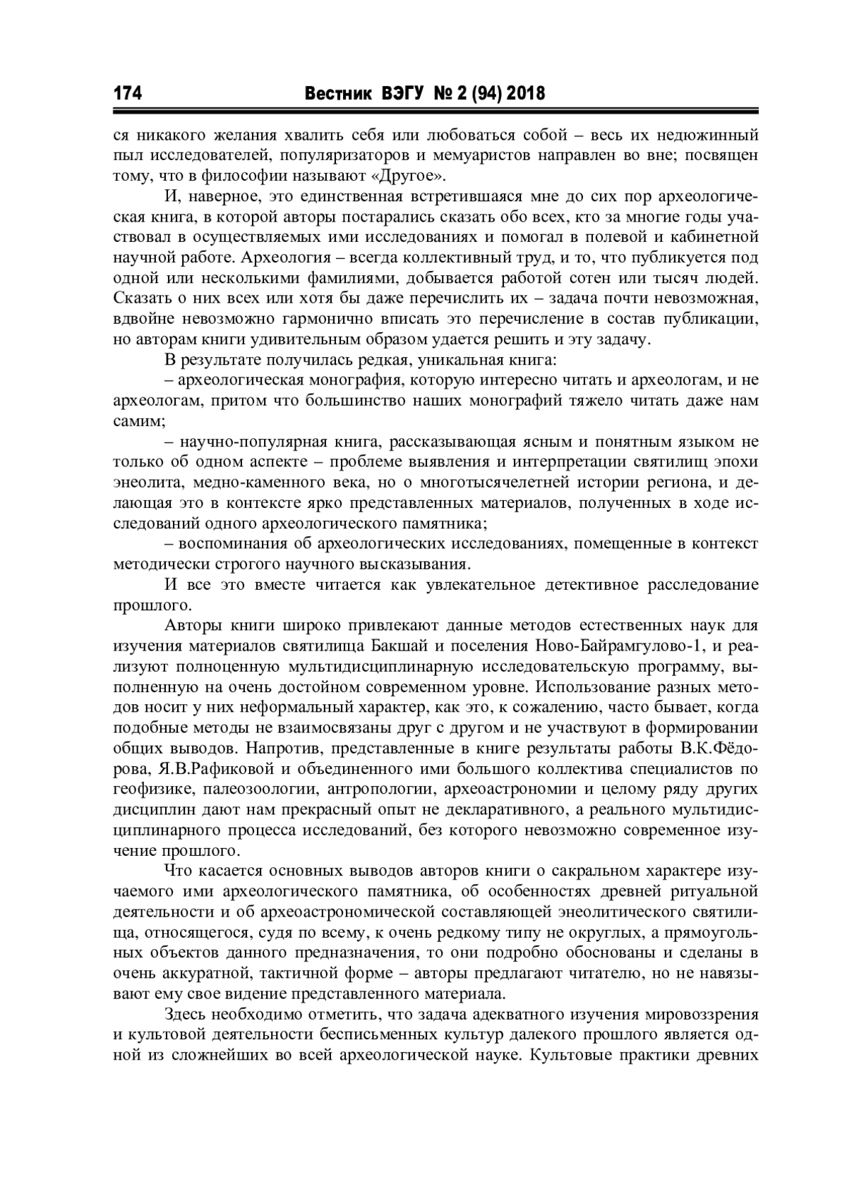 В 2017 году в Уфе в издательстве «Восточная печать» вышла книга В. К. Фё- дорова и Я. В. Рафиковой «Бакшай. Древнее святилище Башкирского края». Прежде всего обращает на себя внимание яркое и необычное сочетание литературных жанров, реализованное авторами. С одной стороны, книга представляет собой полноценную научную монографию, содержащую весьма дотошную и очень качественную публикацию материалов многолетних раскопок энеолитического сооружения, интерпретируемого авторами как остатки святилища; и расположенного поверх него поселения эпохи поздней и финальной бронзы Ново-Байрамгулово-1. При этом скрупулезное изложение зафиксированных фактов и выдвинутых гипотез выполнено красивым и ясным литературным языком, оно не перегружено специфической терминологией и научными жаргонизмами, и сочетается с научно-популярными экскурсами, позволяющими даже не специалисту без обращения к дополнительной литературе свободно читать эту книгу и понимать рассматриваемую в ней проблематику.