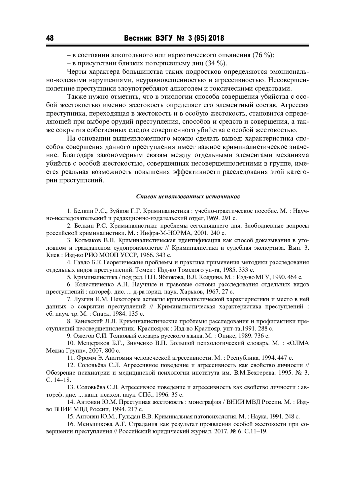 16. Меньшикова А.Г. Страдания как результат проявления особой жестокости при совершении преступления//Электронное приложение к Российскому юридическому журналу. 2017. № 6. С.11-19. EDN: YQDIRT