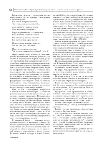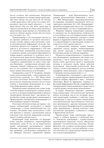 Проблема комментирования художественного текста в настоящее время актуальна как для академического литературоведения, так и для методики обучения литературе. Однако если в отечественной филологии принципам комментирования художественного произведения посвящено множество исследований, в том числе ставшие классическими работы Б. М. Томашевского, В. В. Виноградова, С. А. Рейсера, Ю. М. Лотмана, то в методике литературного образования эта проблема в полной мере остается не разработанной.