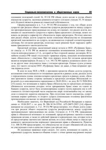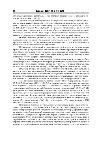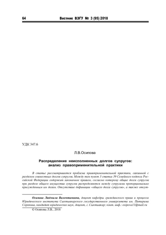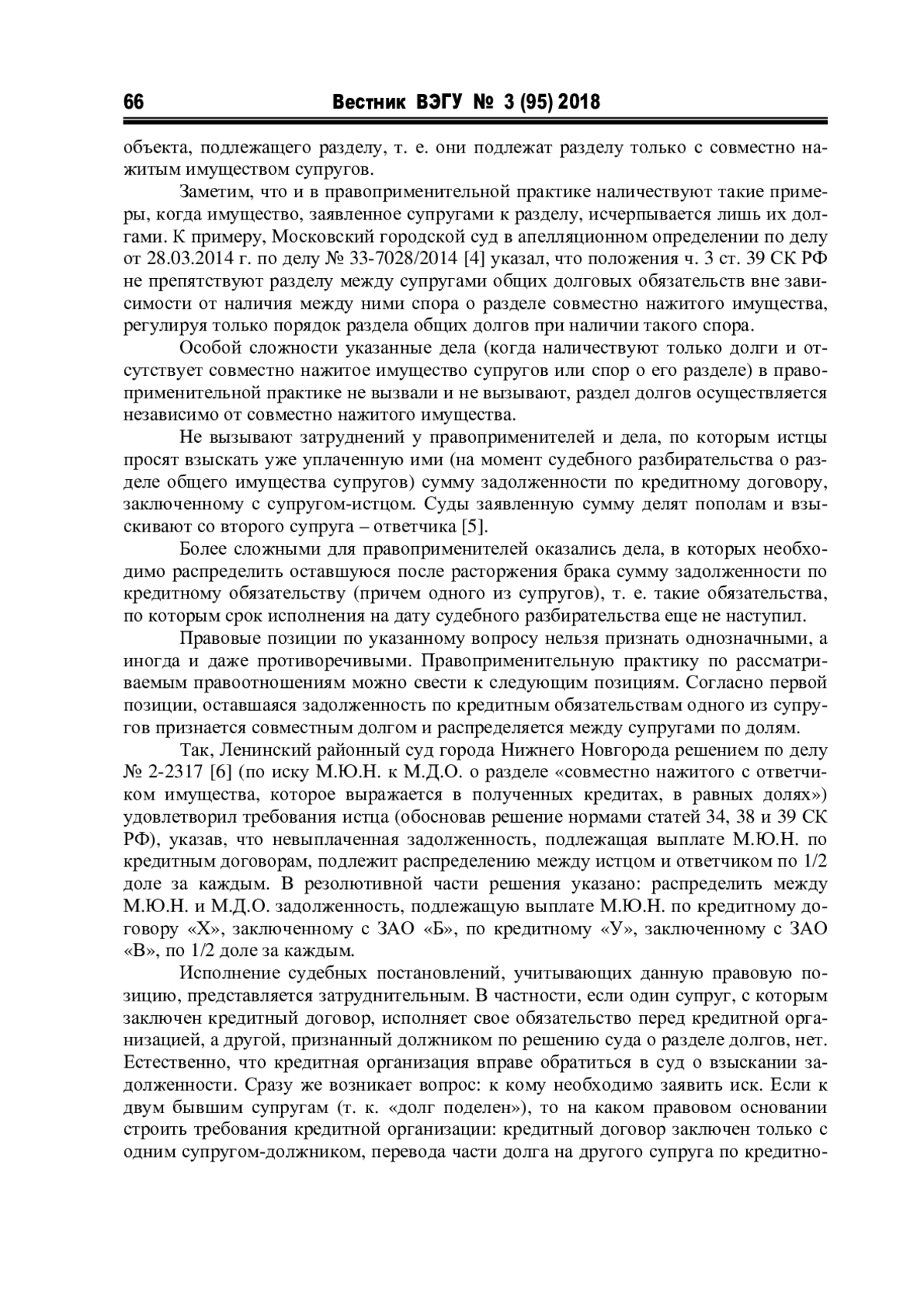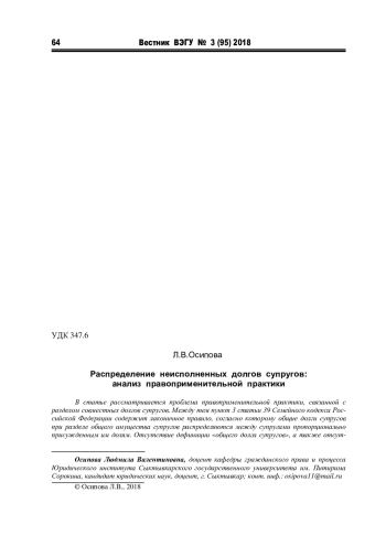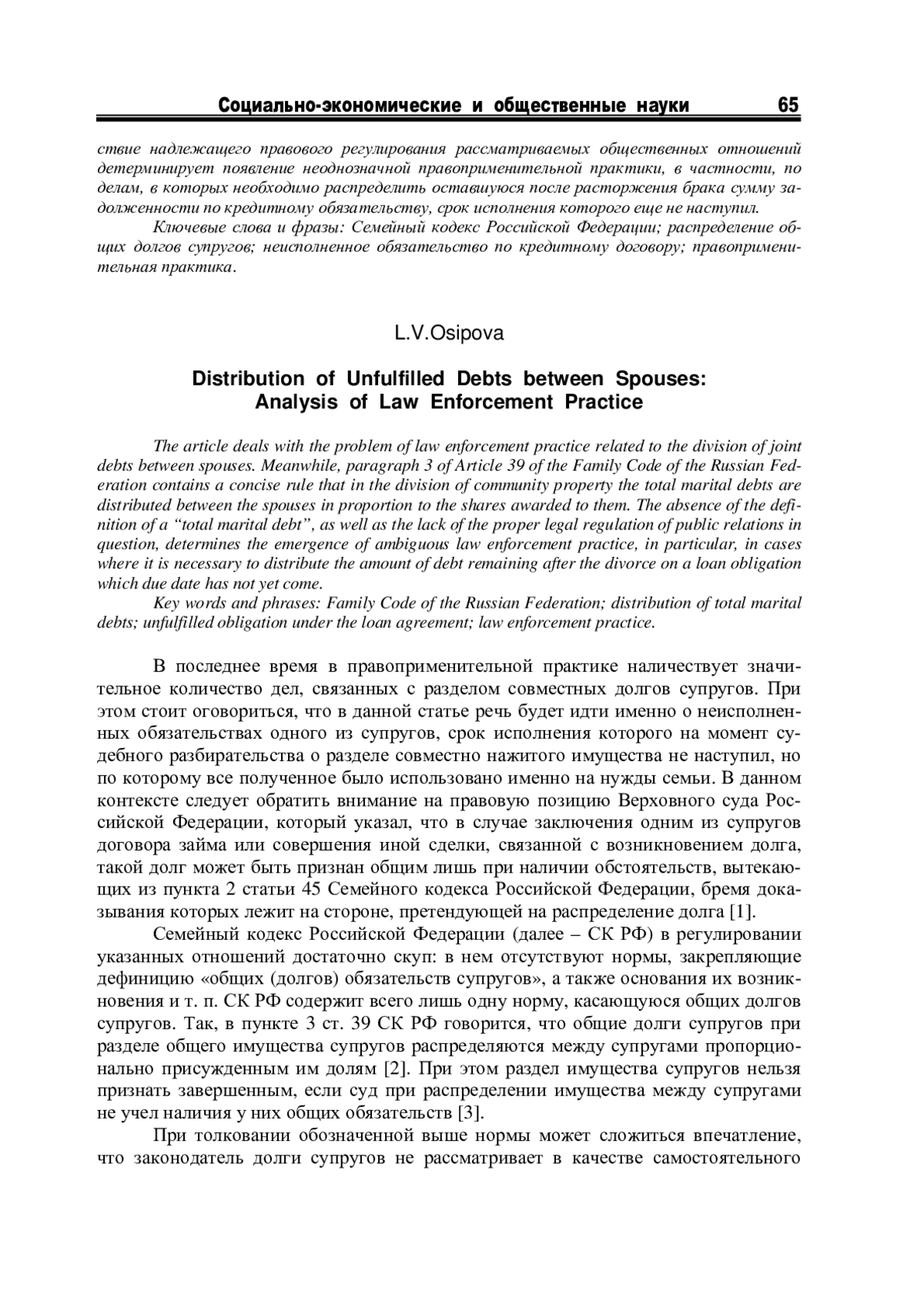 В статье рассматривается проблема правоприменительной практики, связанной с разделом совместных долгов супругов. Между тем пункт 3 статьи 39 Семейного кодекса Российской Федерации содержит лаконичное правило, согласно которому общие долги супругов при разделе общего имущества супругов распределяются между супругами пропорционально присужденным им долям. Отсутствие дефиниции «общего долга супругов», а также отсутствие надлежащего правового регулирования рассматриваемых общественных отношений детерминирует появление неоднозначной правоприменительной практики, в частности, по делам, в которых необходимо распределить оставшуюся после расторжения брака сумму задолженности по кредитному обязательству, срок исполнения которого еще не наступил.