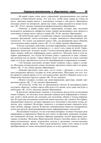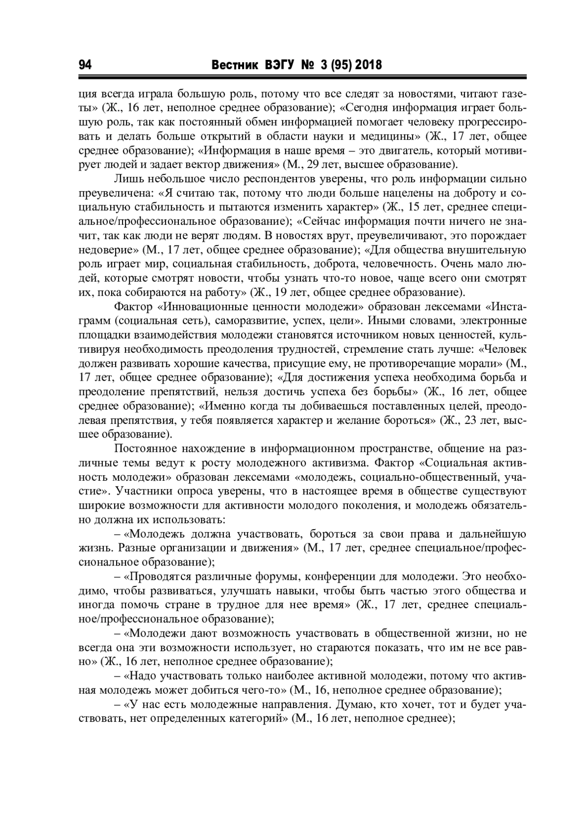 В статье представлены результаты регионального социологического исследования «Ценностные ориентации молодежи Нижегородской области», проведенного в ноябре–декабре 2017 г. Рассматриваются основные направления динамики духовно-нравственных потребностей молодежи и способы их реализации. Метод контент-анализа глубинных интервью молодых людей 15–32 лет показал сосуществование, соединение трех элементов в структуре молодежных ценностей, которые авторами определяются как традиционные, молодежные, инновационные