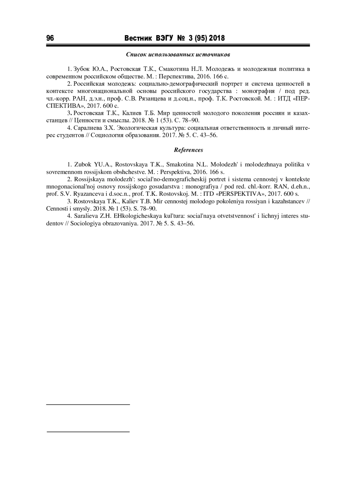 3. Ростовская Т.К., Калиев Т.Б. Мир ценностей молодого поколения россиян и казахстанцев // Ценности и смыслы. 2018. № 1 (53). С. 78-90. EDN: YSMAXW