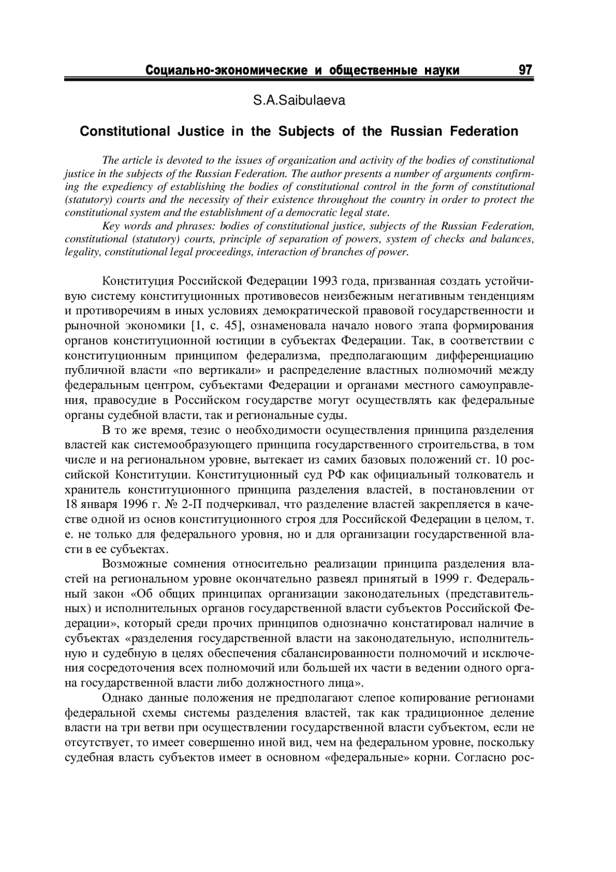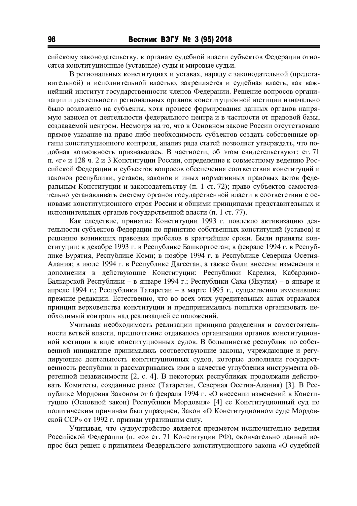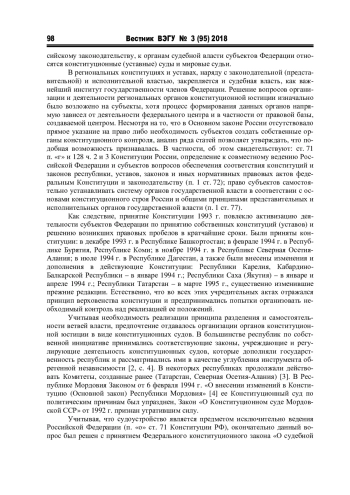 Конституция Российской Федерации 1993 года, призванная создать устойчивую систему конституционных противовесов неизбежным негативным тенденциям и противоречиям в иных условиях демократической правовой государственности и рыночной экономики [1, с. 45], ознаменовала начало нового этапа формирования органов конституционной юстиции в субъектах Федерации. Так, в соответствии с конституционным принципом федерализма, предполагающим дифференциацию публичной власти «по вертикали» и распределение властных полномочий между федеральным центром, субъектами Федерации и органами местного самоуправления, правосудие в Российском государстве могут осуществлять как федеральные органы судебной власти, так и региональные суды.