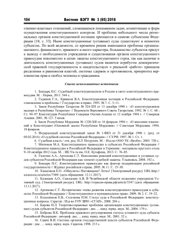 14. Борова И.Л. Теоретико-правовые проблемы организации конституционных (уставных) судов субъектов Российской Федерации: дис.. канд. юрид. наук. М., 2004. 179 с. EDN: NMRRKZ