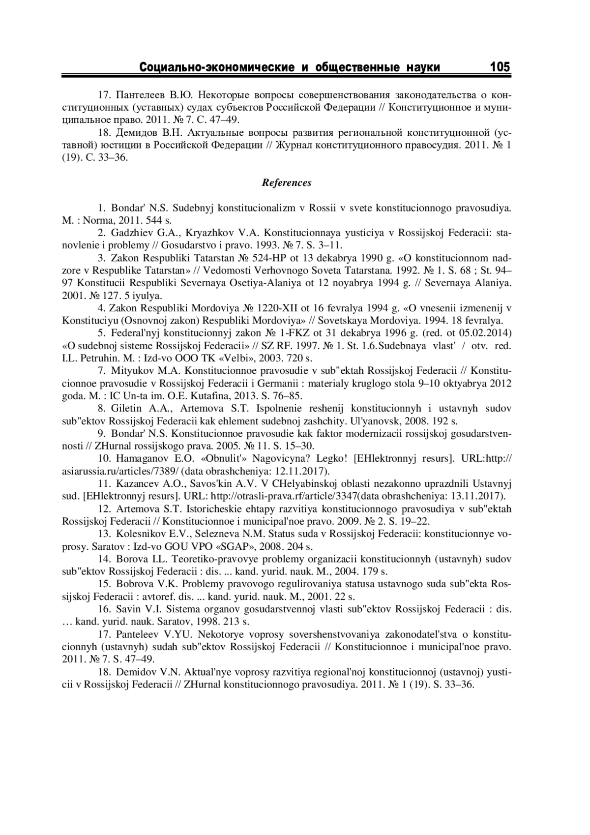 17. Пантелеев В.Ю. Некоторые вопросы совершенствования законодательства о конституционных (уставных) судах субъектов Российской Федерации // Конституционное и муниципальное право. 2011. № 7. С. 47-49. EDN: OEDIHD